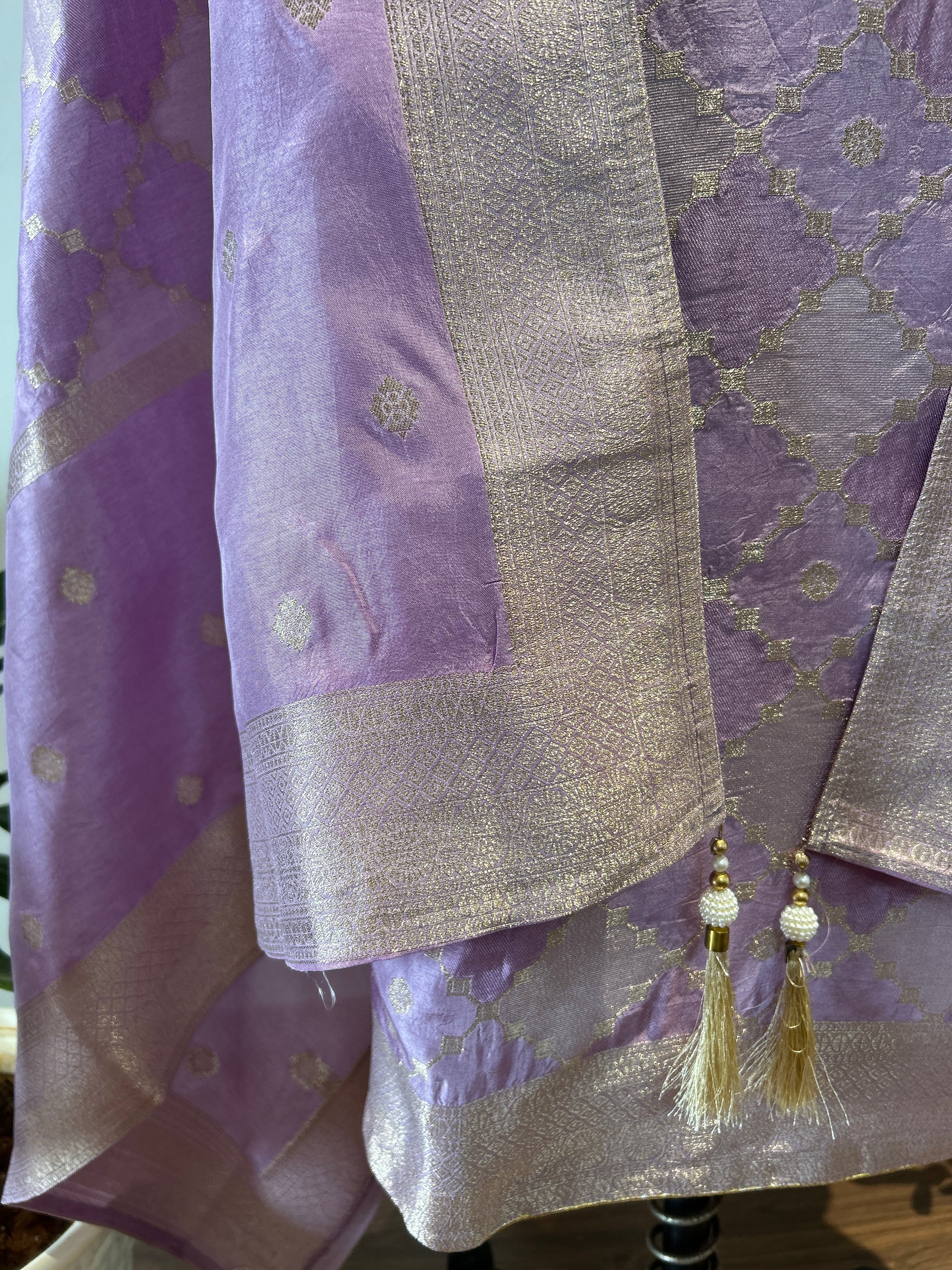 Elevate your formal wardrobe with this exquisite lilac silk ensemble, featuring a sophisticated geometric pattern that commands attention.
