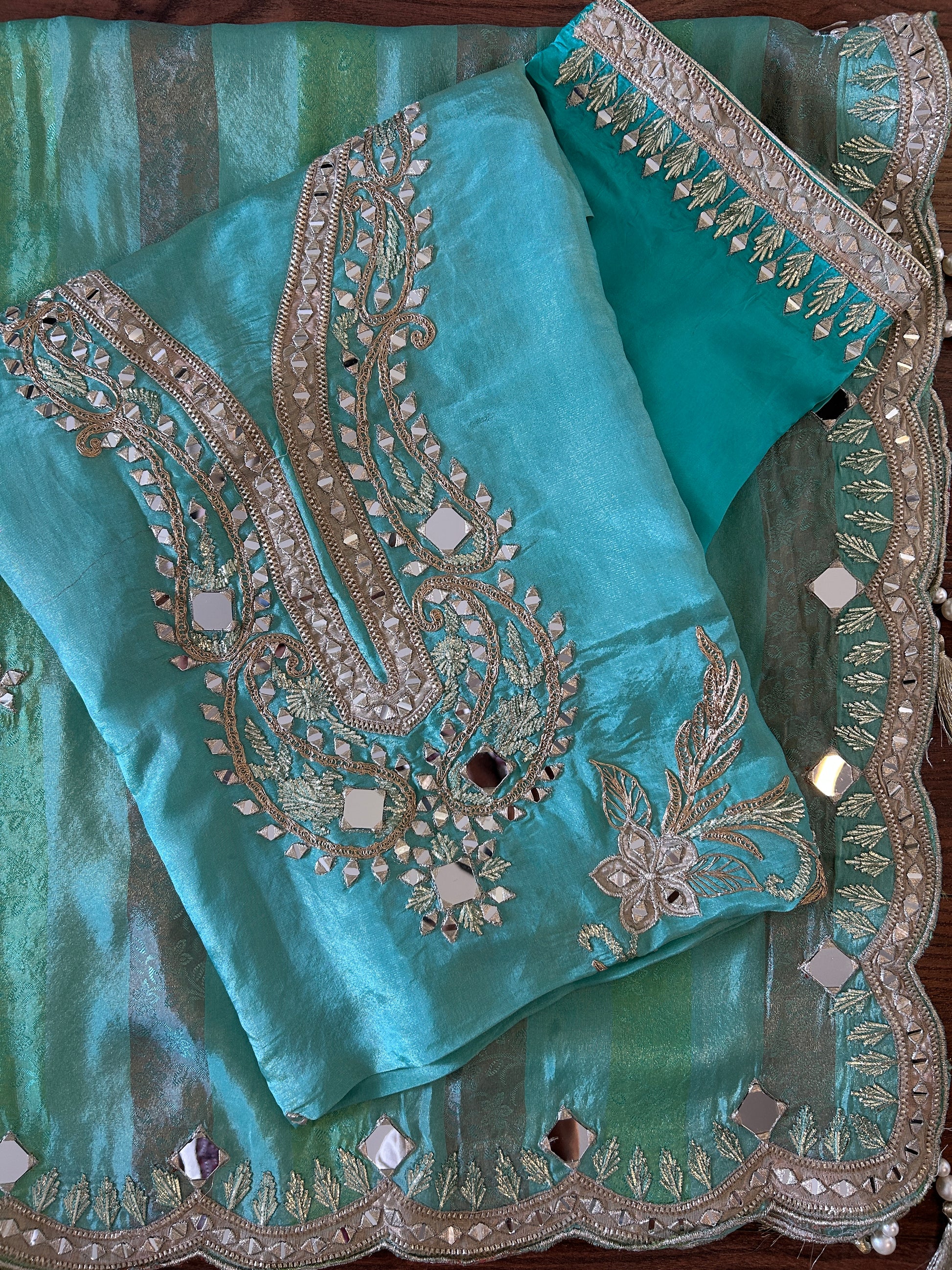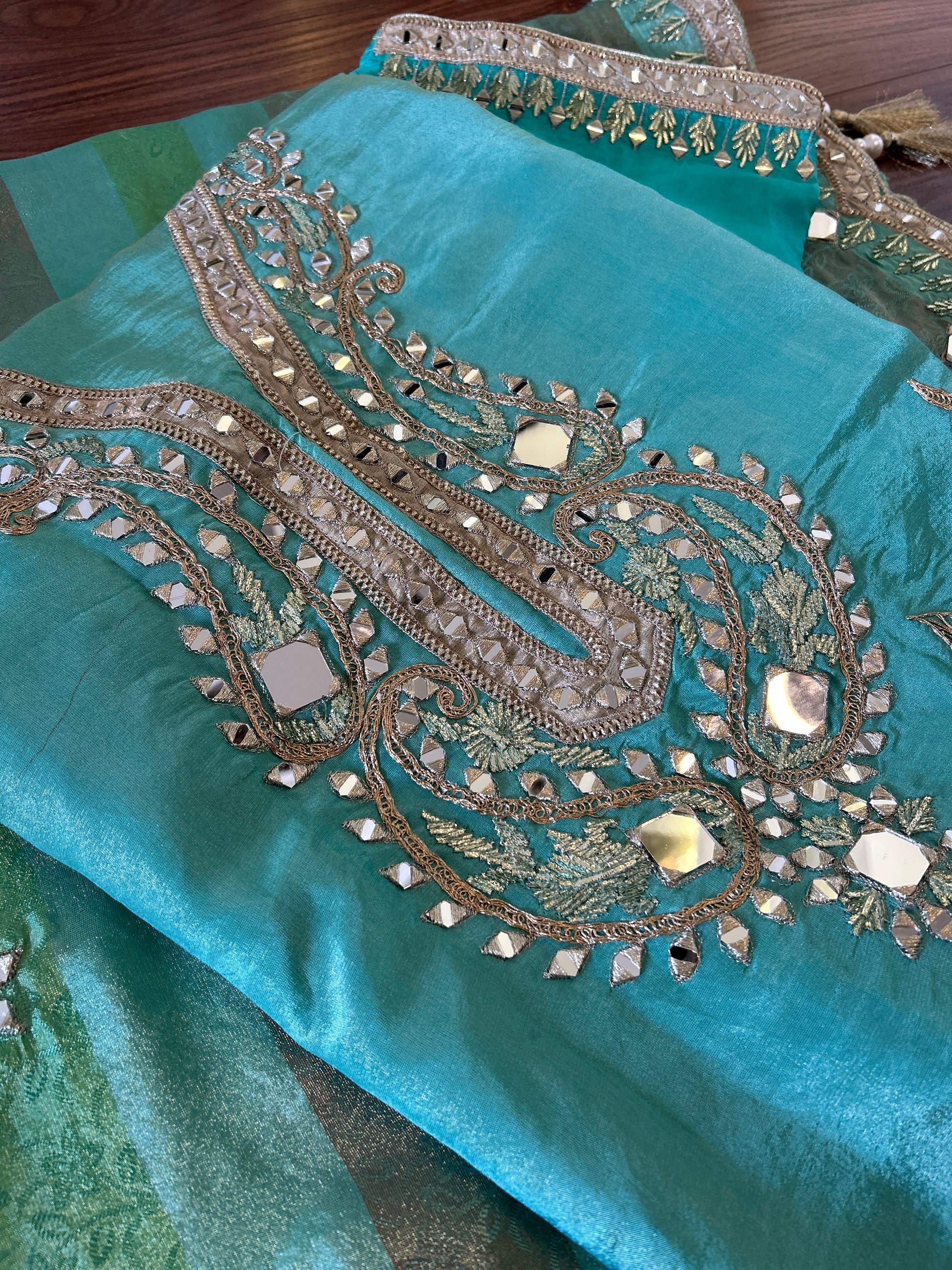 Shimmer Organza Shirt with Handcrafted Mirror Work on Neckline – 2.5 meters