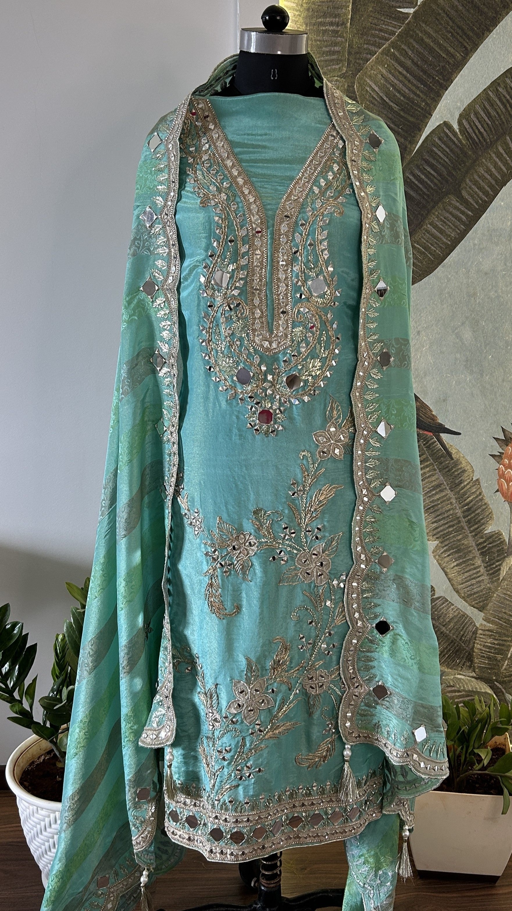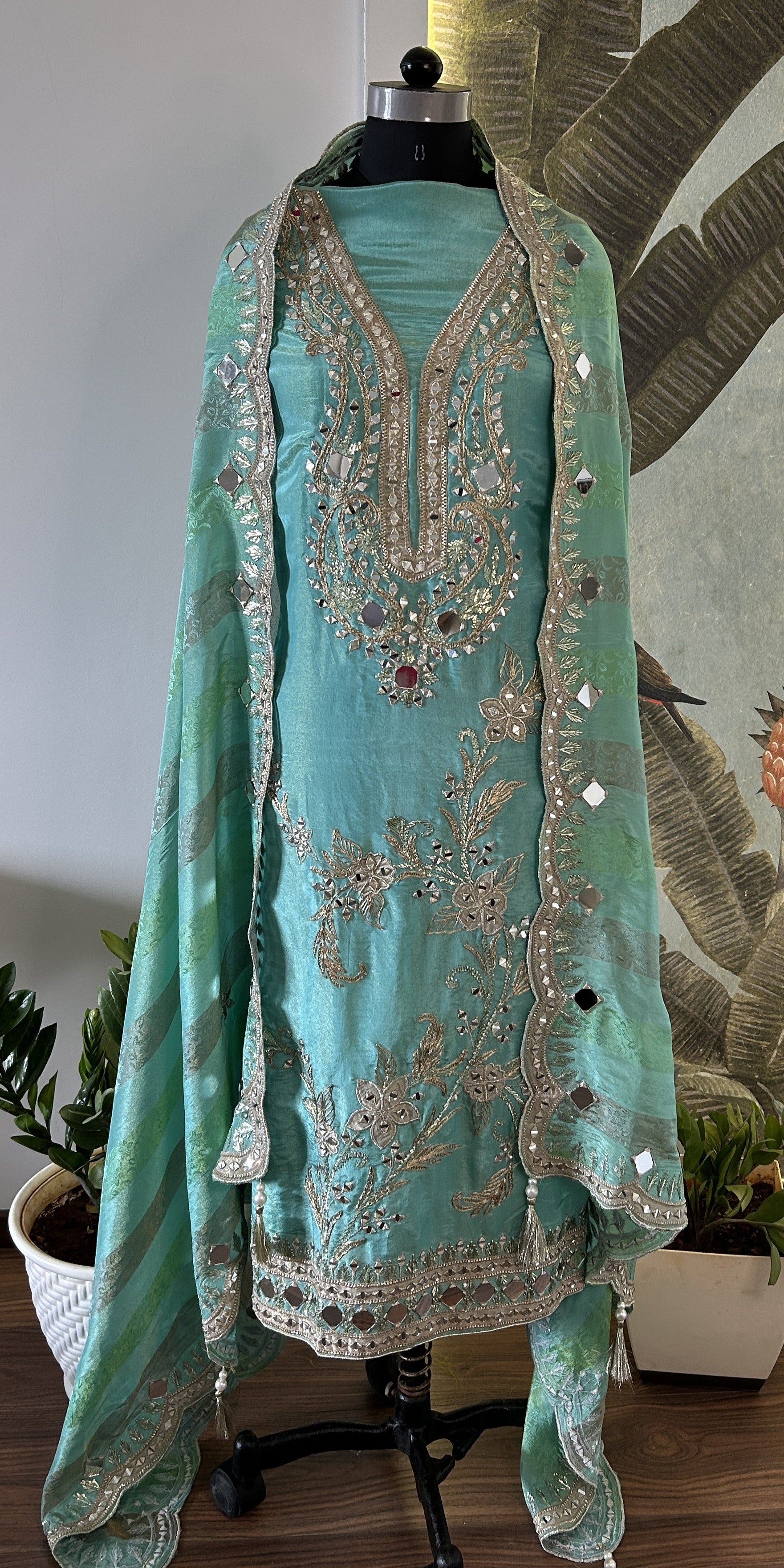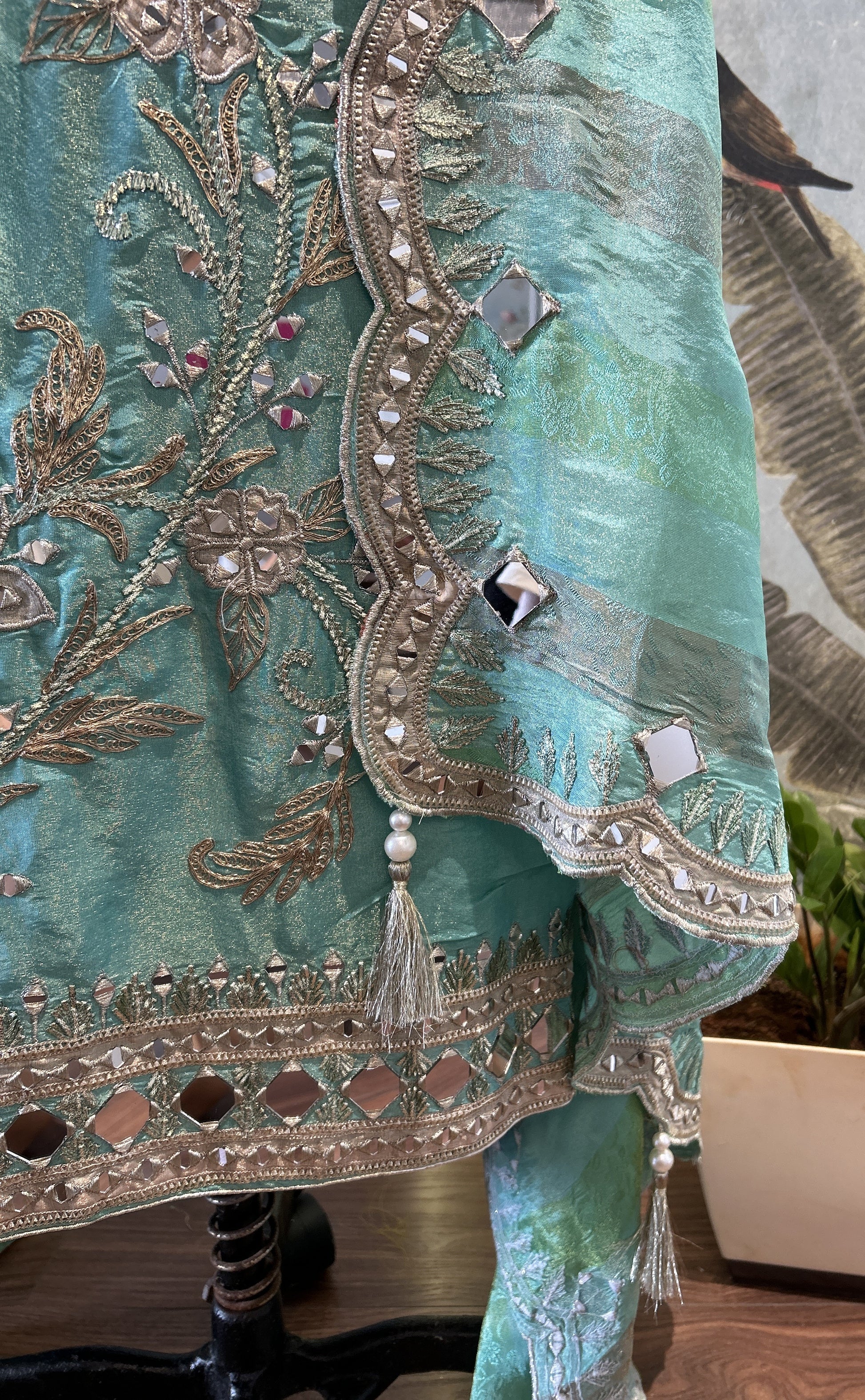 A breath of serenity wrapped in opulence, “Chaandni Baagh” is crafted in a refreshing mint green hue that evokes dew-kissed mornings and moonlit evenings. The fabric is adorned with intricate floral and floral embroidery in gold and silver threads, elevated by delicate mirror work that sparkles with every movement.