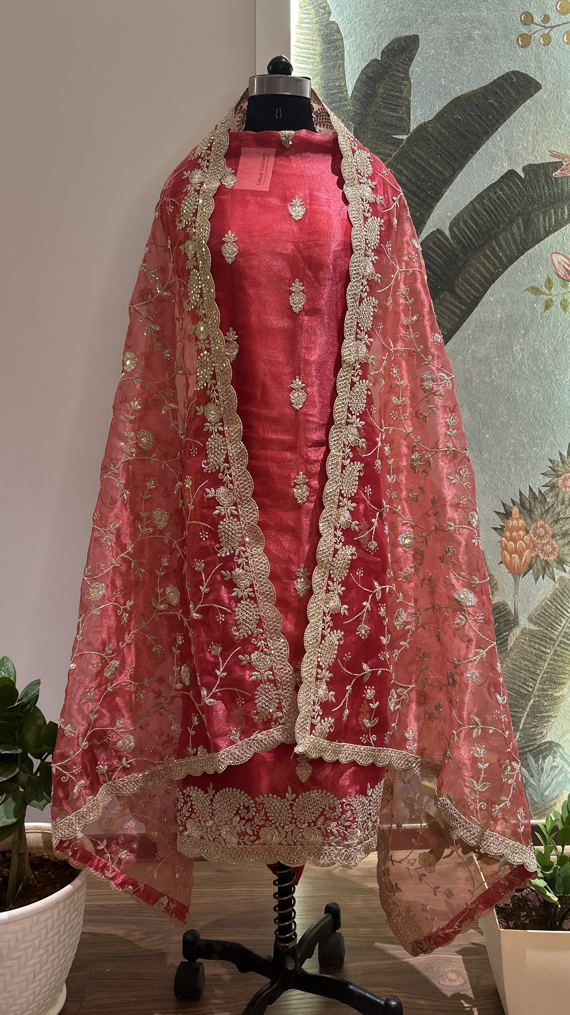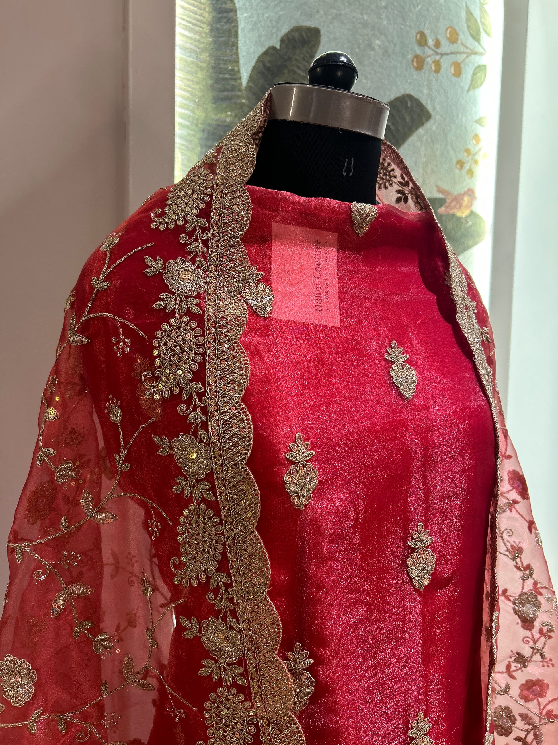 Sindoori Saaz sings of bridal dreams and festive rhythms. The suits vermilion base echoes the sacred sindoor, while the ornate gold embroidery plays like a classical raga across its folds.