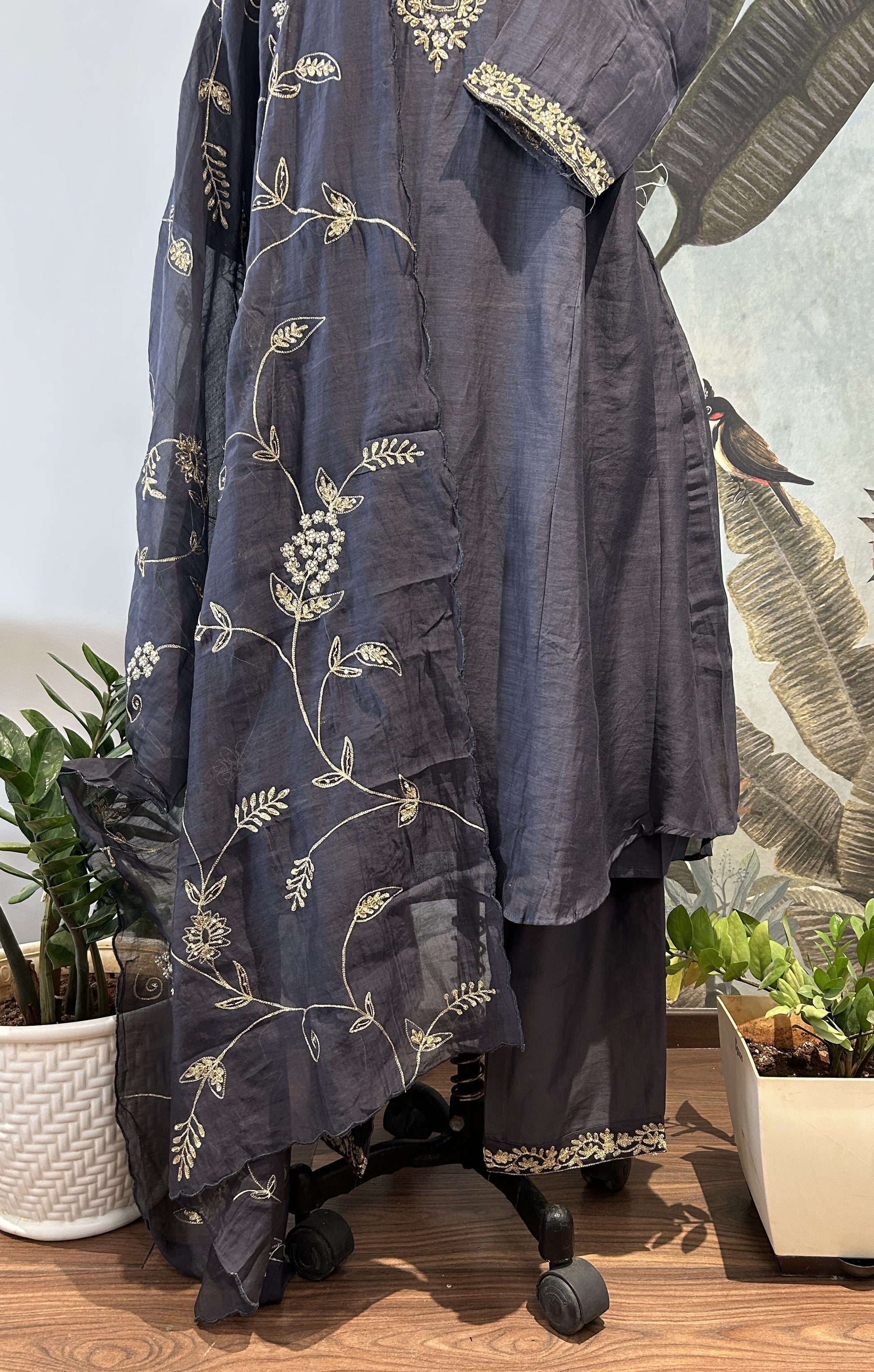 Crafted from luxurious Chanderi fabric, this ensemble showcases refined gold embroidery adorning the neckline and sleeves with sophisticated precision.