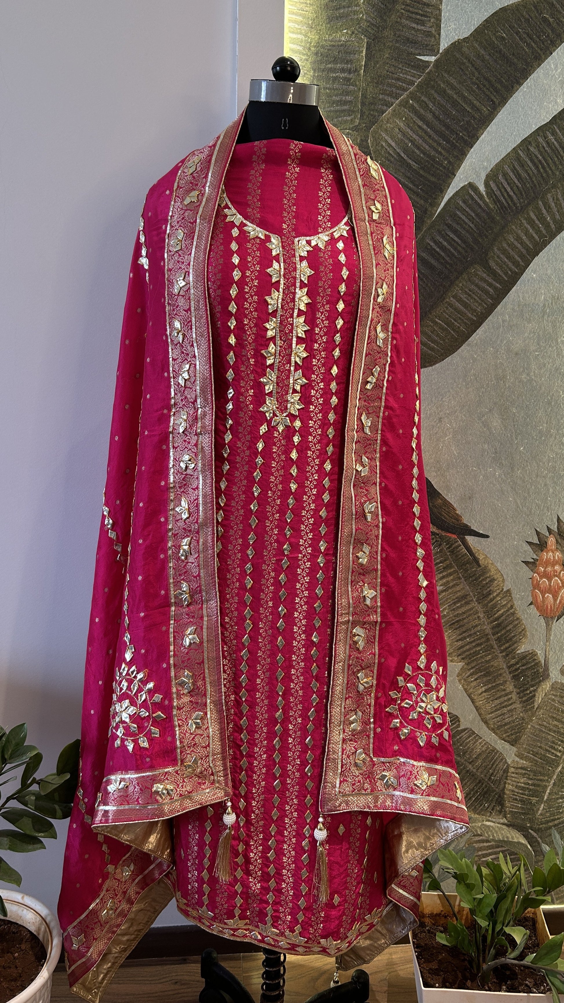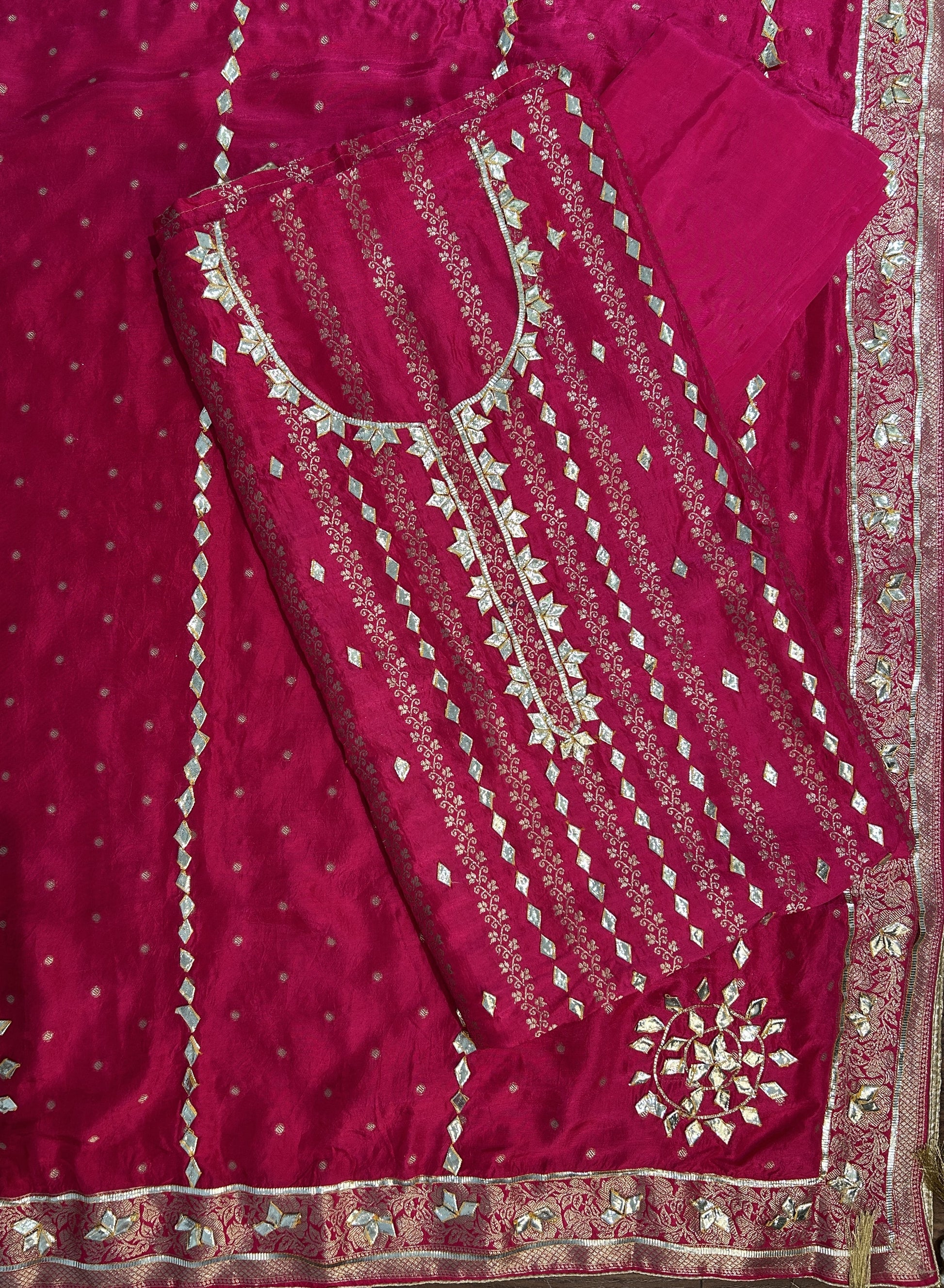 Experience timeless elegance with this exquisite Banarasi silk ensemble, featuring intricate all-over gota work that adds a radiant finish perfect for grand celebrations. The set includes a 2.5-meter Banarasi silk suit, richly embellished; a 2.25-meter dupatta with detailed gota accents enhancing its luxurious appeal; and a smooth silk bottom (2.5 meters) that balances the ensemble with understated sophistication.