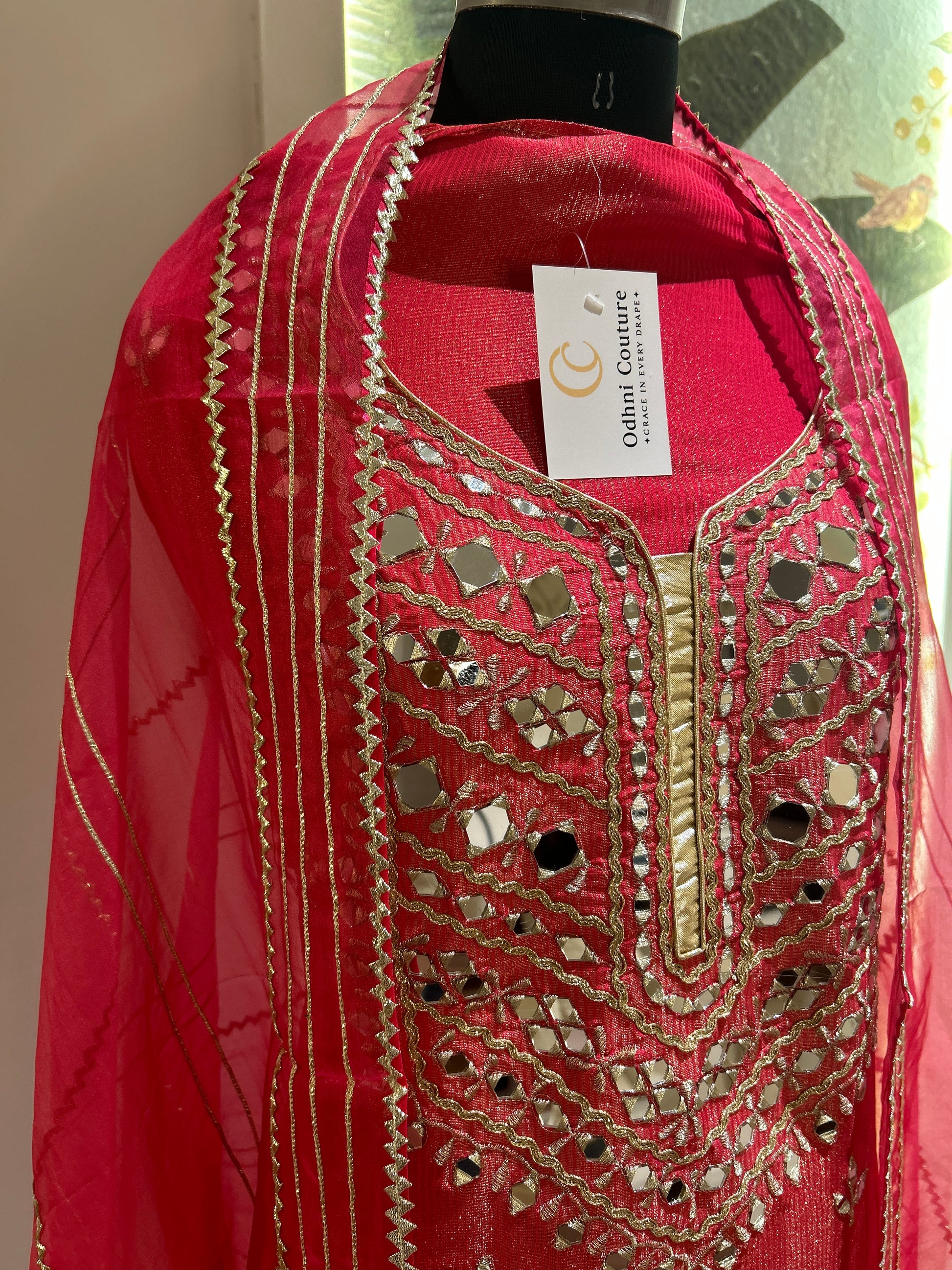 Gulnaar Jhalak captures the essence of festive celebration in luminous shimmer silk fabric adorned with mirror work and gota patti, delicate embroidery that shimmer with every movement.