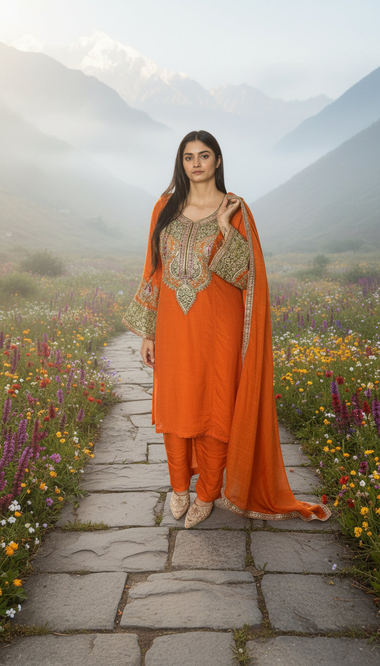 The matching salwar flows like a flame, while the dupatta — edged in ornate brilliance — drapes the wearer in regal grace.