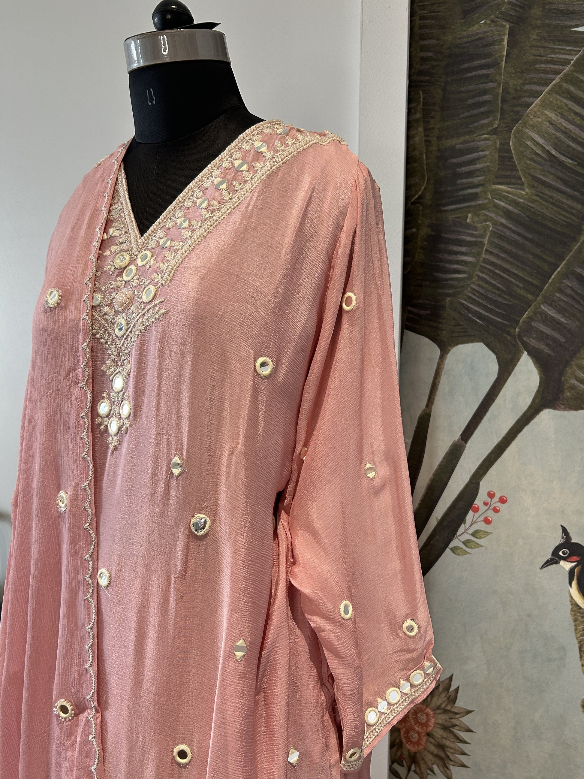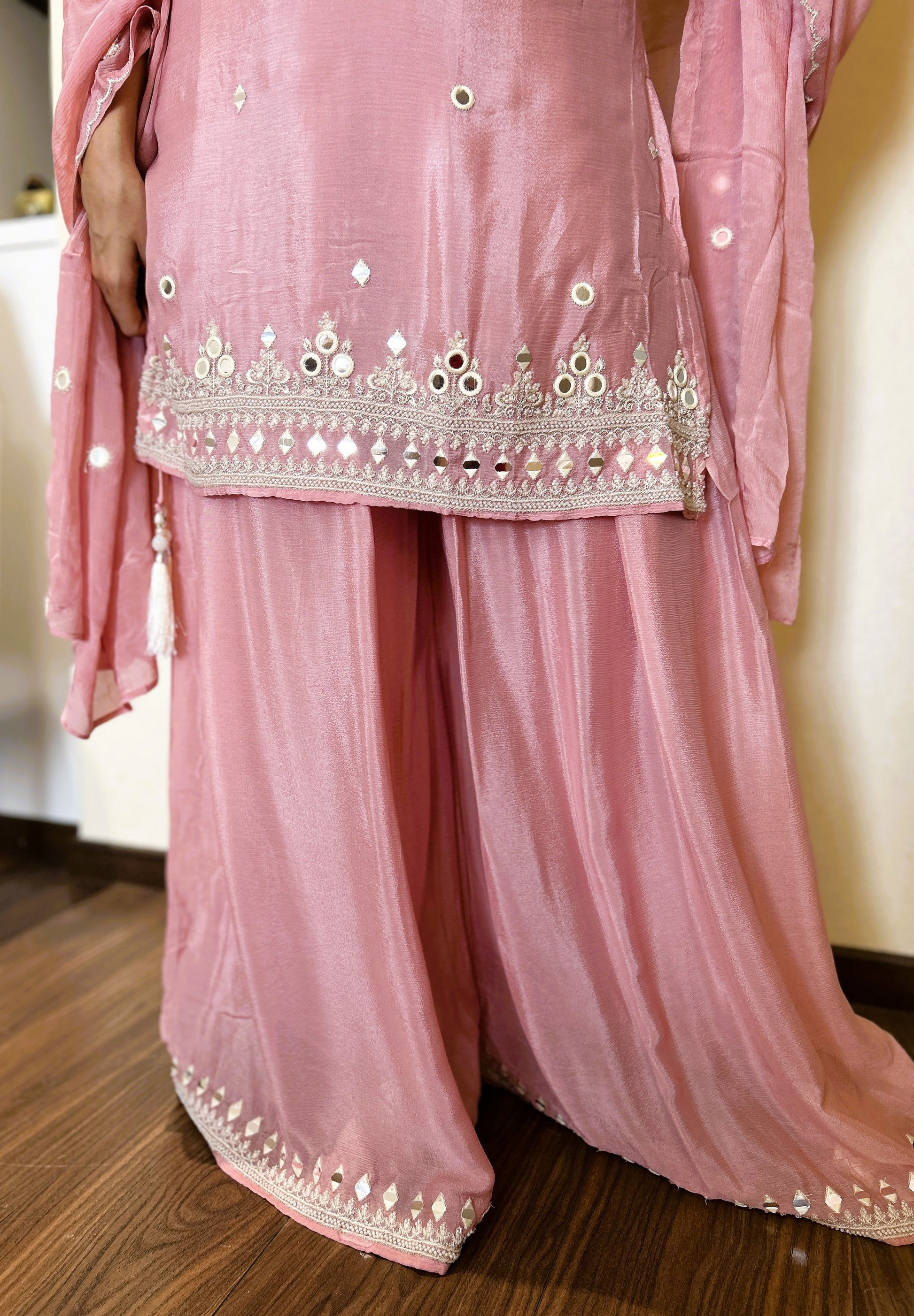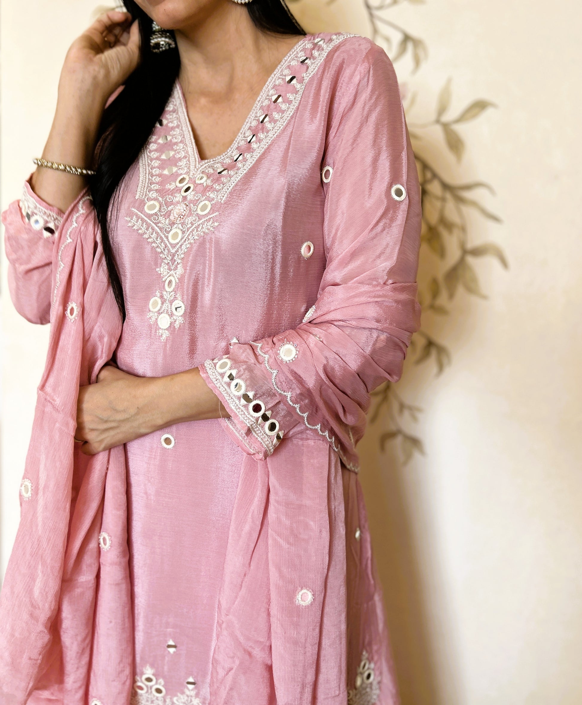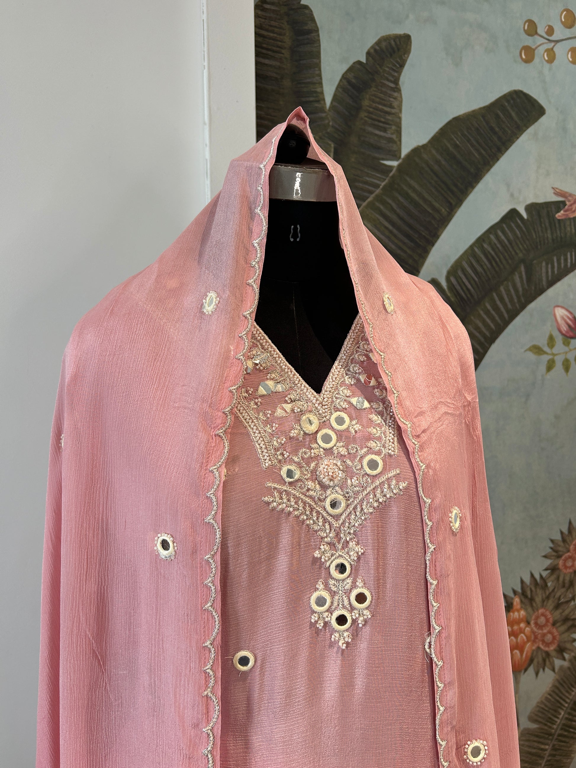 Introducing Gulnoor, an exquisite ensemble that celebrates timeless elegance through masterful craftsmanship. This stunning piece features luxurious blush pink chiffon elevated by crisp white embroidery that creates a striking visual harmony.