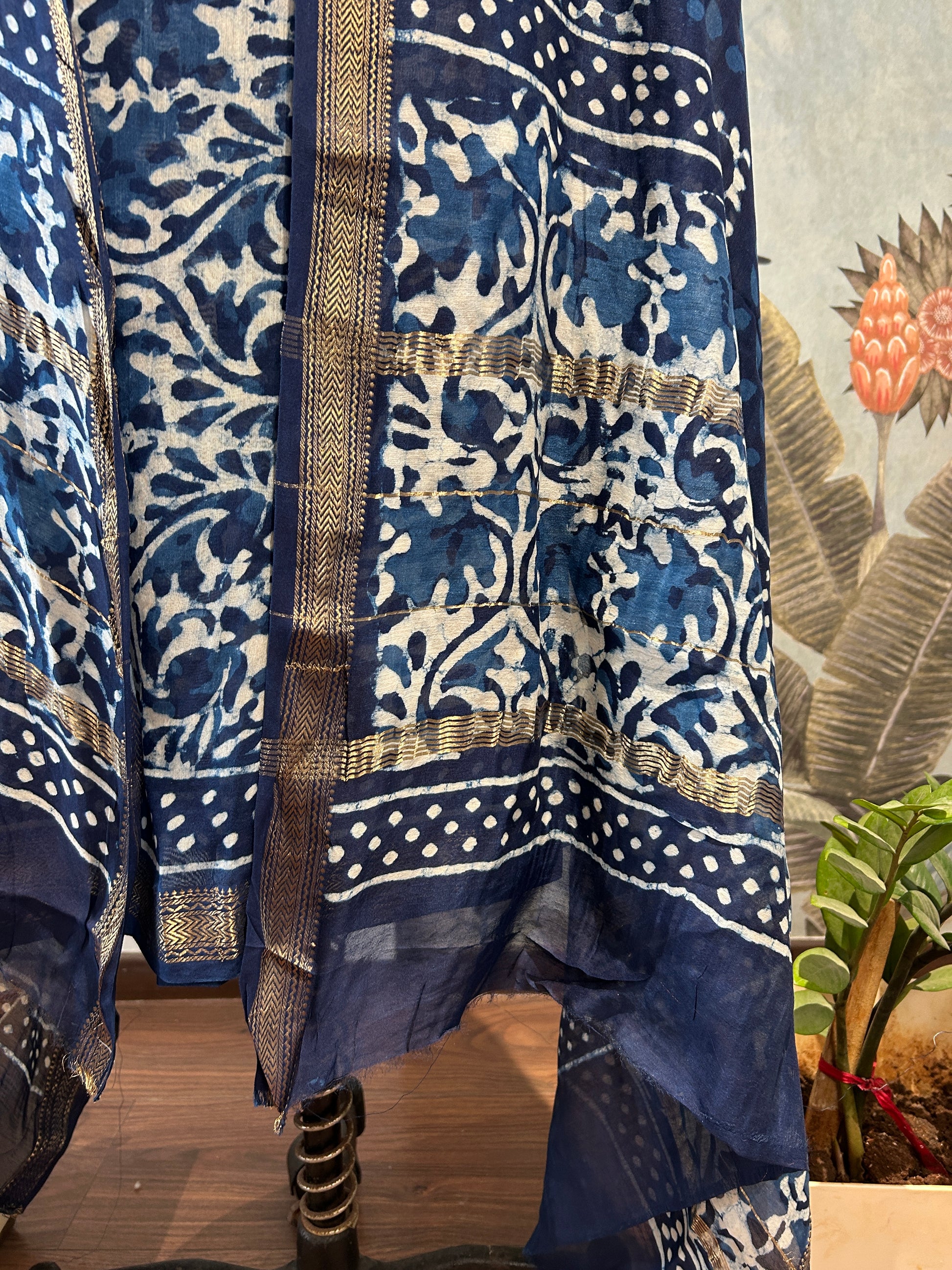 Embrace timeless elegance with this indigo ensemble featuring traditional block print detailing and a lustrous gold border.