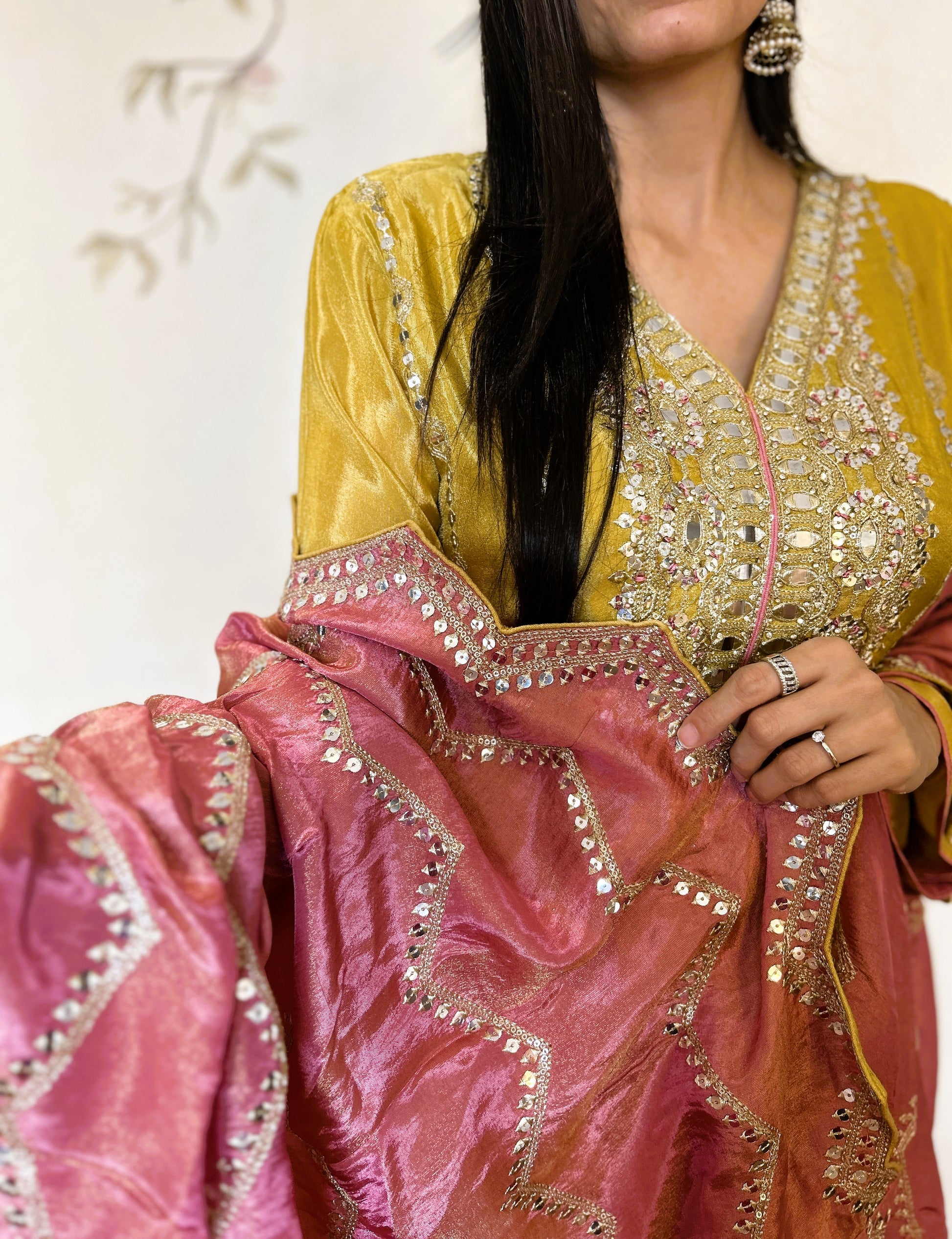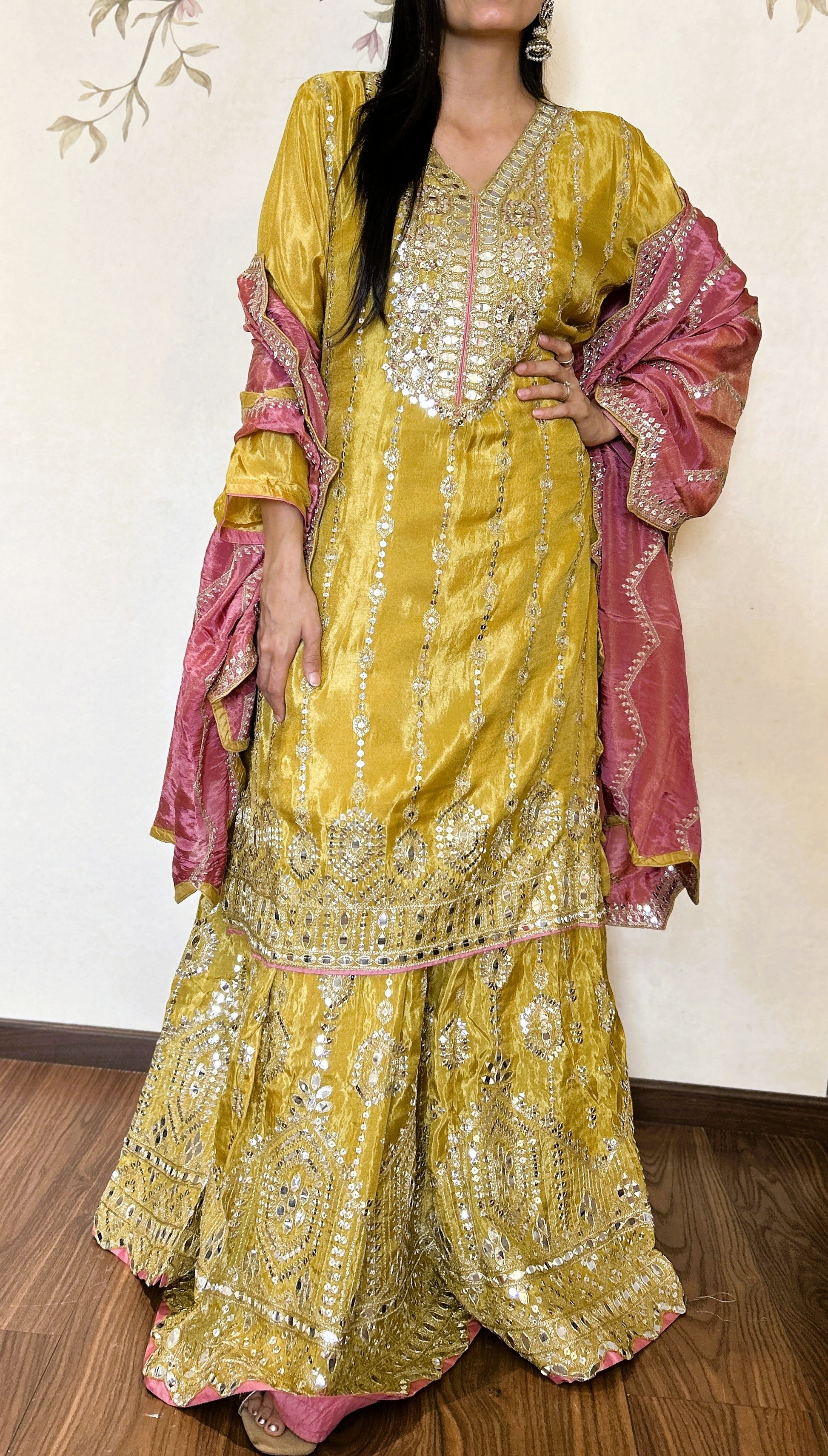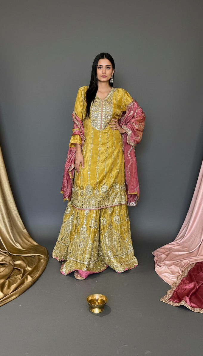 Kanakprabha is a luminous yellow sharara set crafted in glossy silk chinon and adorned with intricate silver embroidery and mirror work.