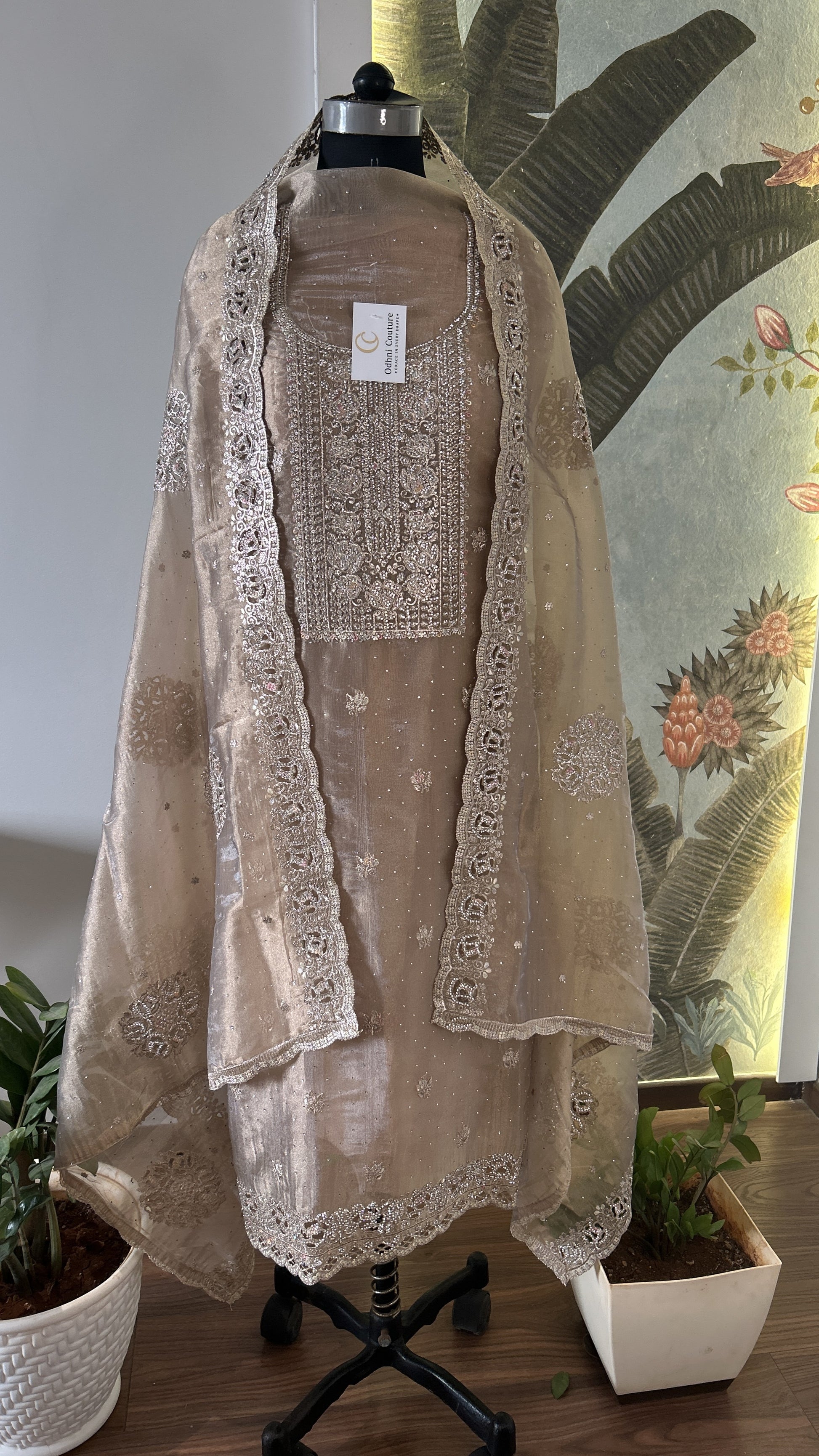 - Organza (2.5 mtrs) – Lightweight yet rich, designed with intricate Cutwork and stone shine work
