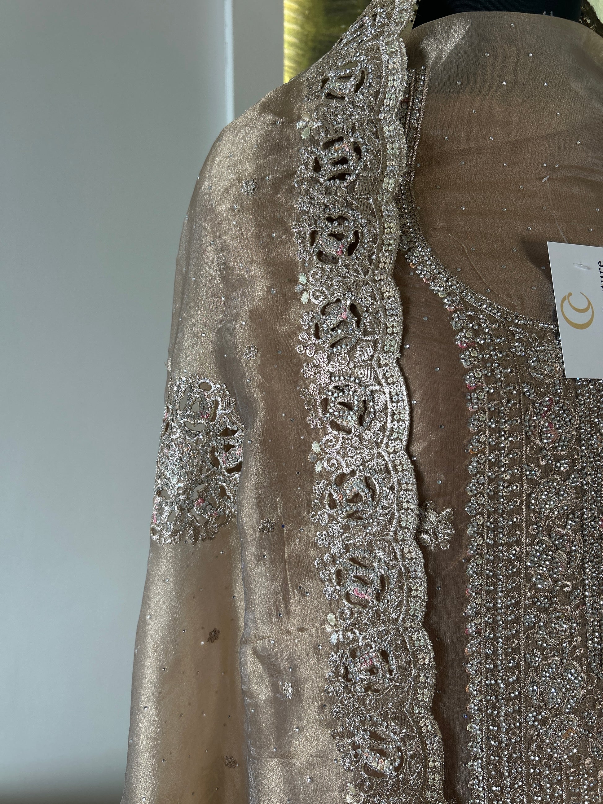 Elevate your wedding wardrobe with this exquisite three-piece ensemble crafted from lustrous organza in rich copper tones.