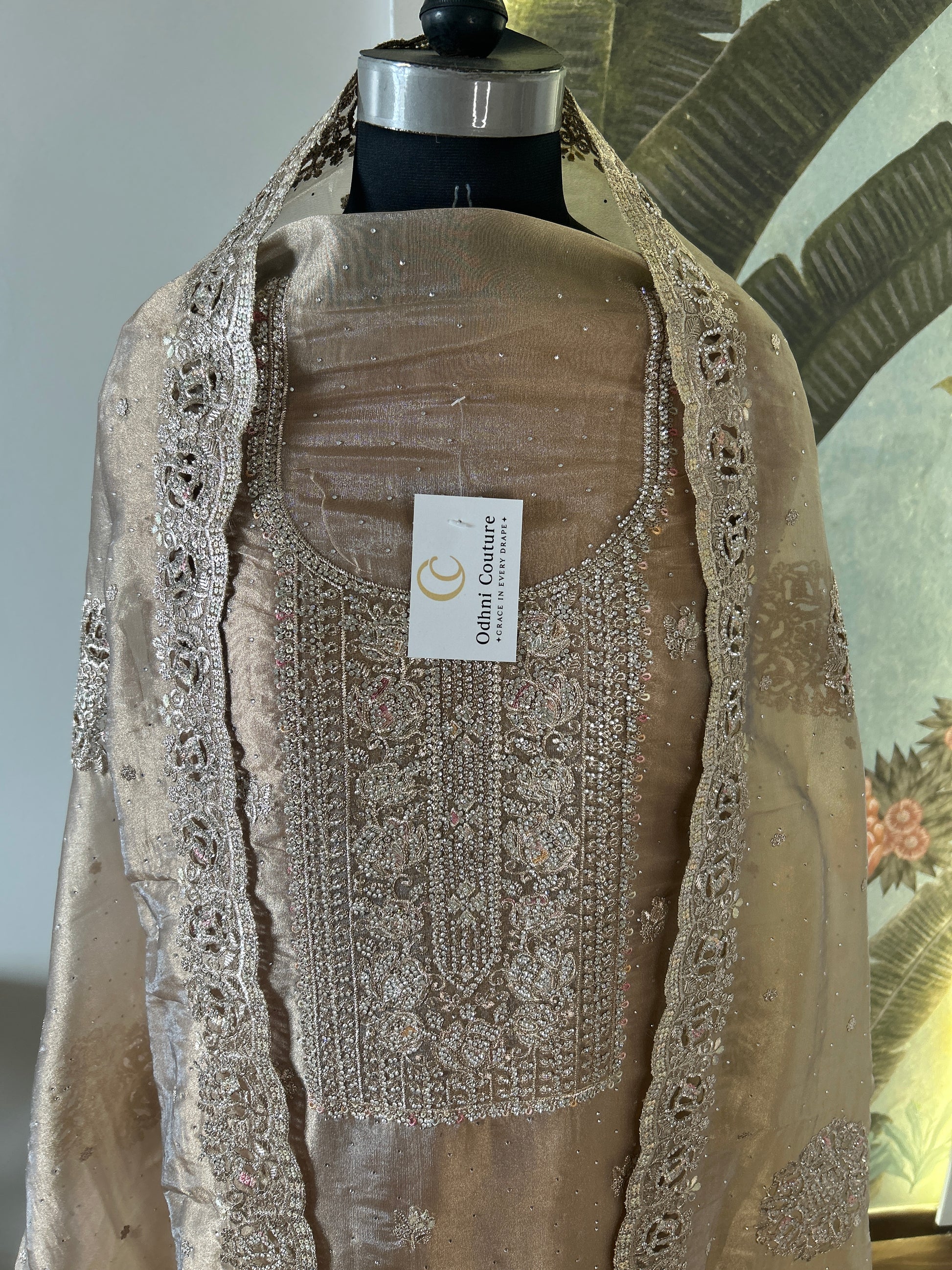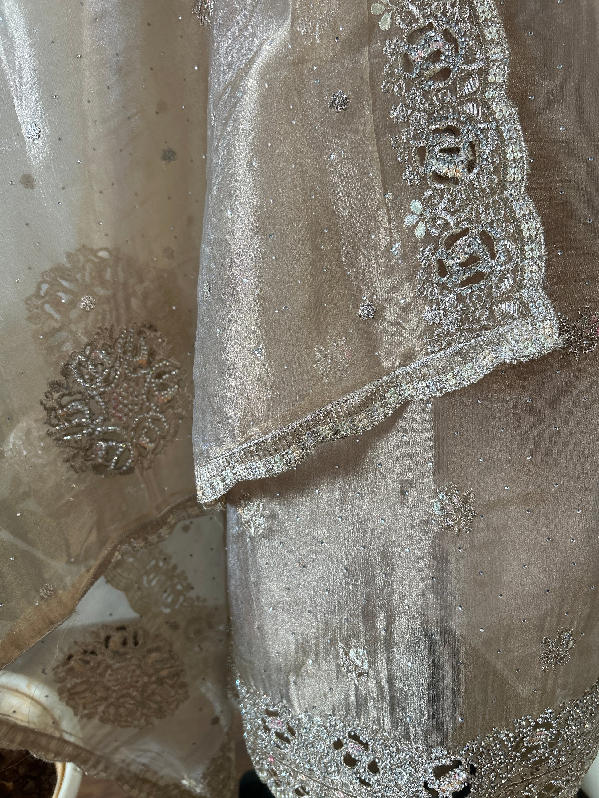 The intricately embroidered top and bottom feature delicate cutwork detailing that showcases masterful craftsmanship, while the heavy dupatta completes the sophisticated silhouette.