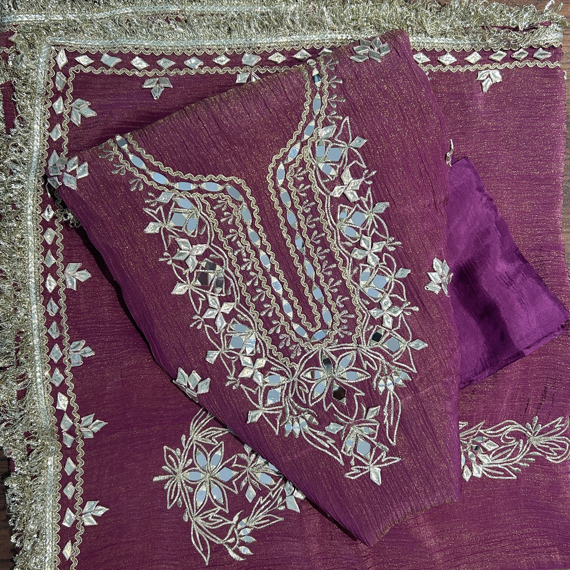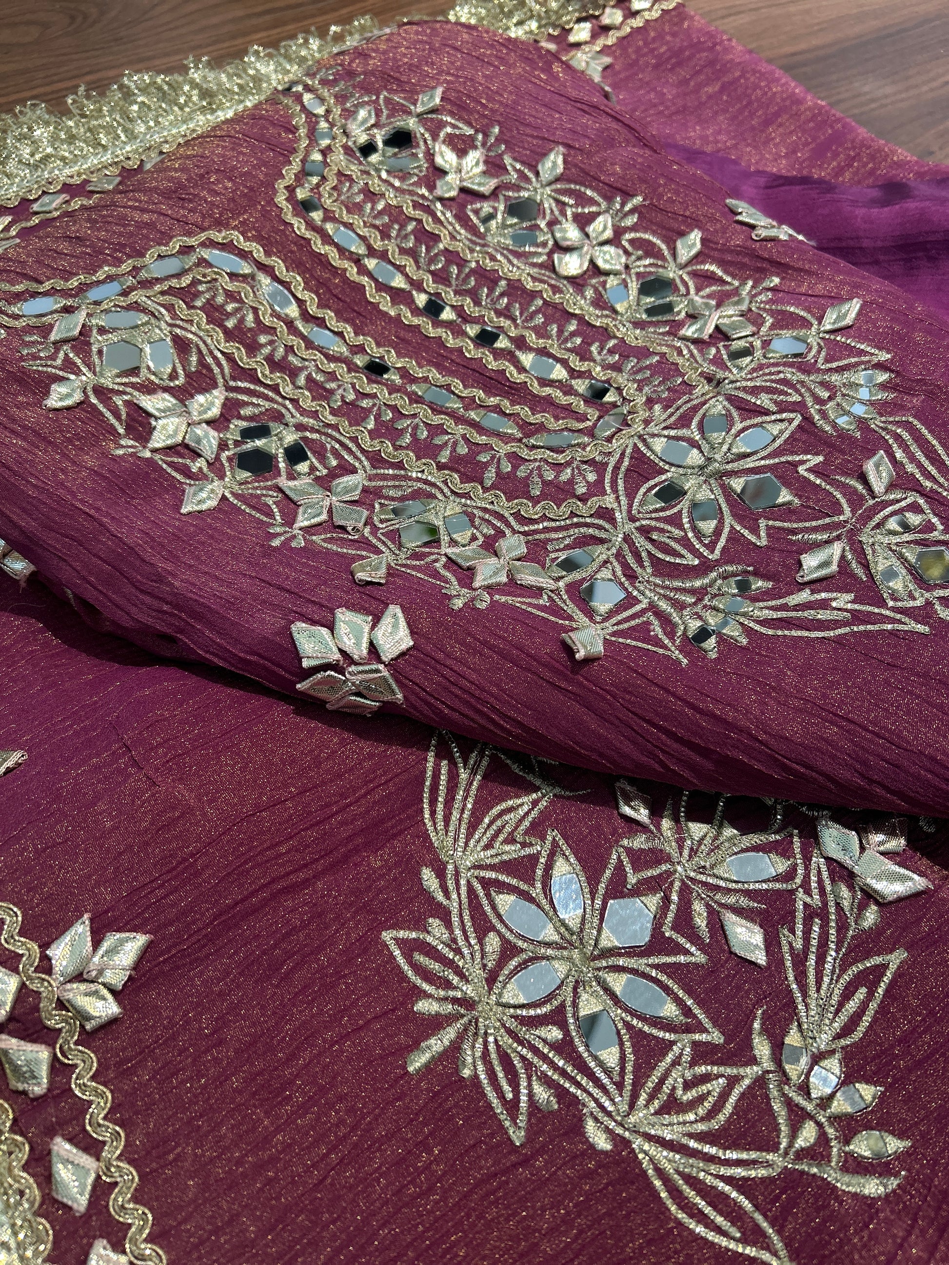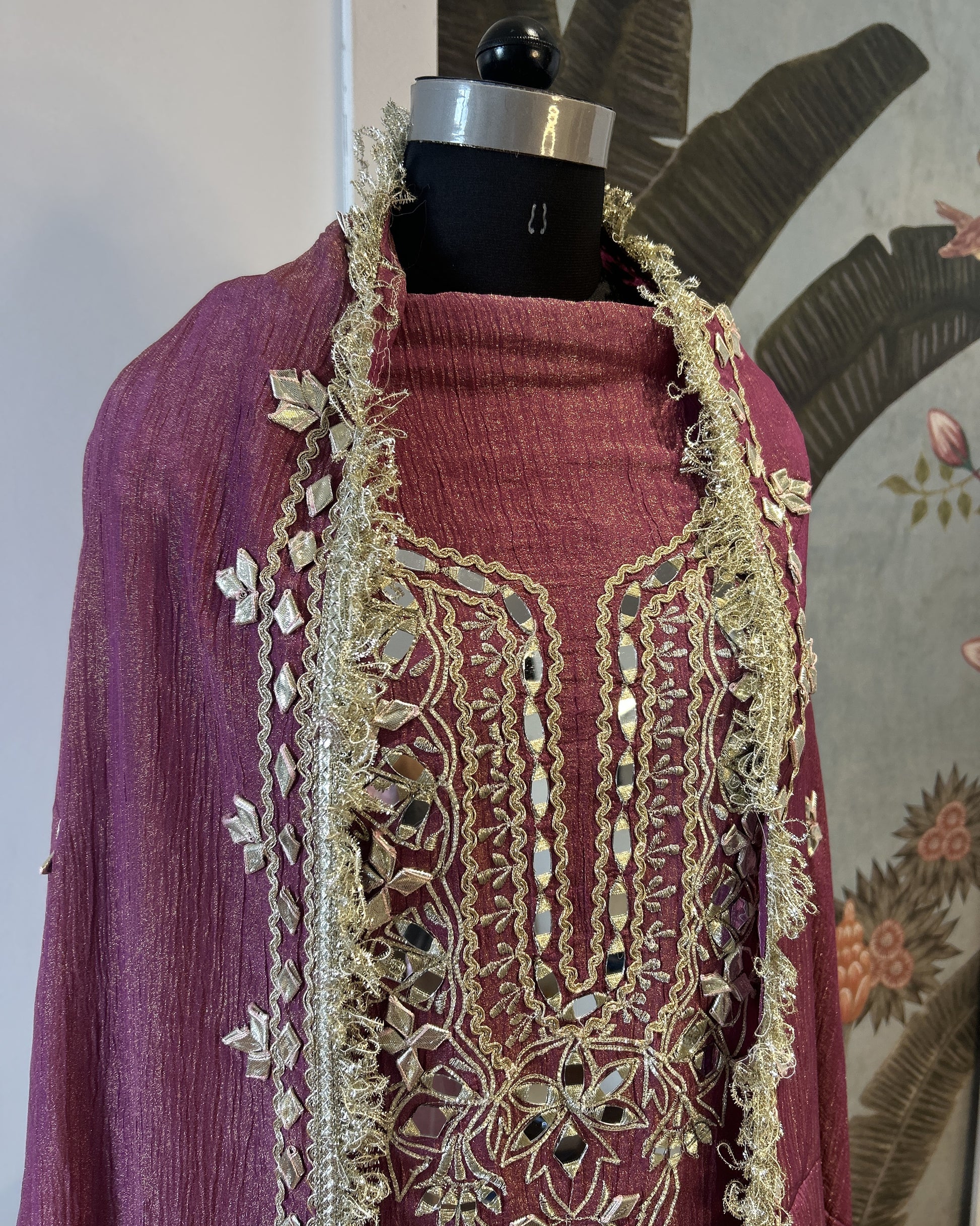 Where heritage meets haute couture—this outfit is adorned with delicate gota vines and floral bursts, stitched in radiant gold and silver. The reflective textures catch the light with every movement, making it ideal for twilight weddings and celebratory evenings.