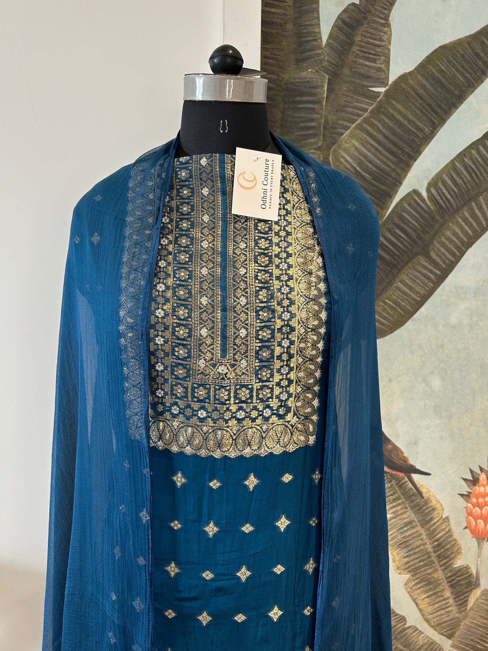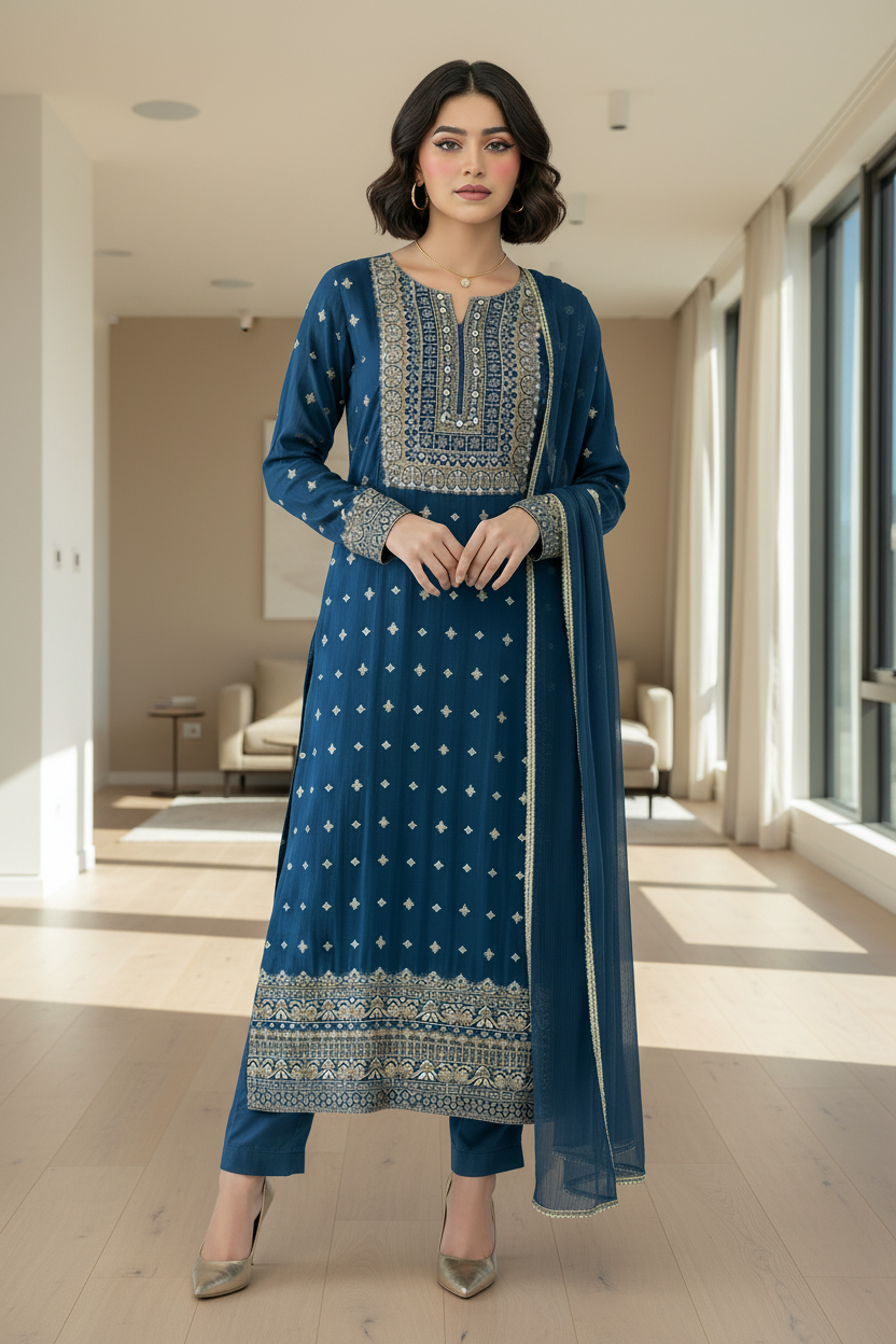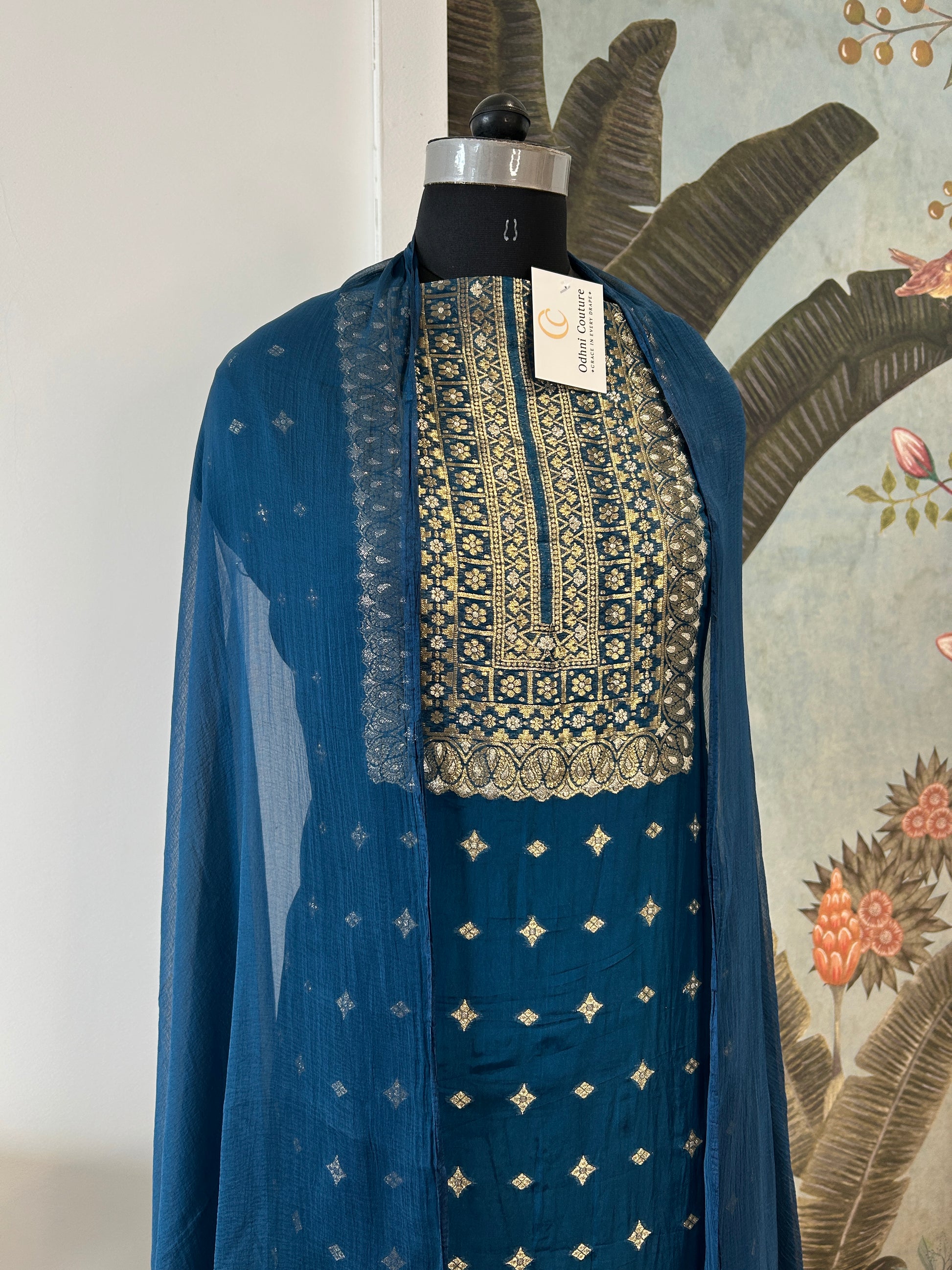 NEELTARA captures the mystique of a starlit evening in luxurious fabric and meticulous craftsmanship. Crafted from silk , this ensemble drapes with an elegant fluidity while maintaining a refined sheen.