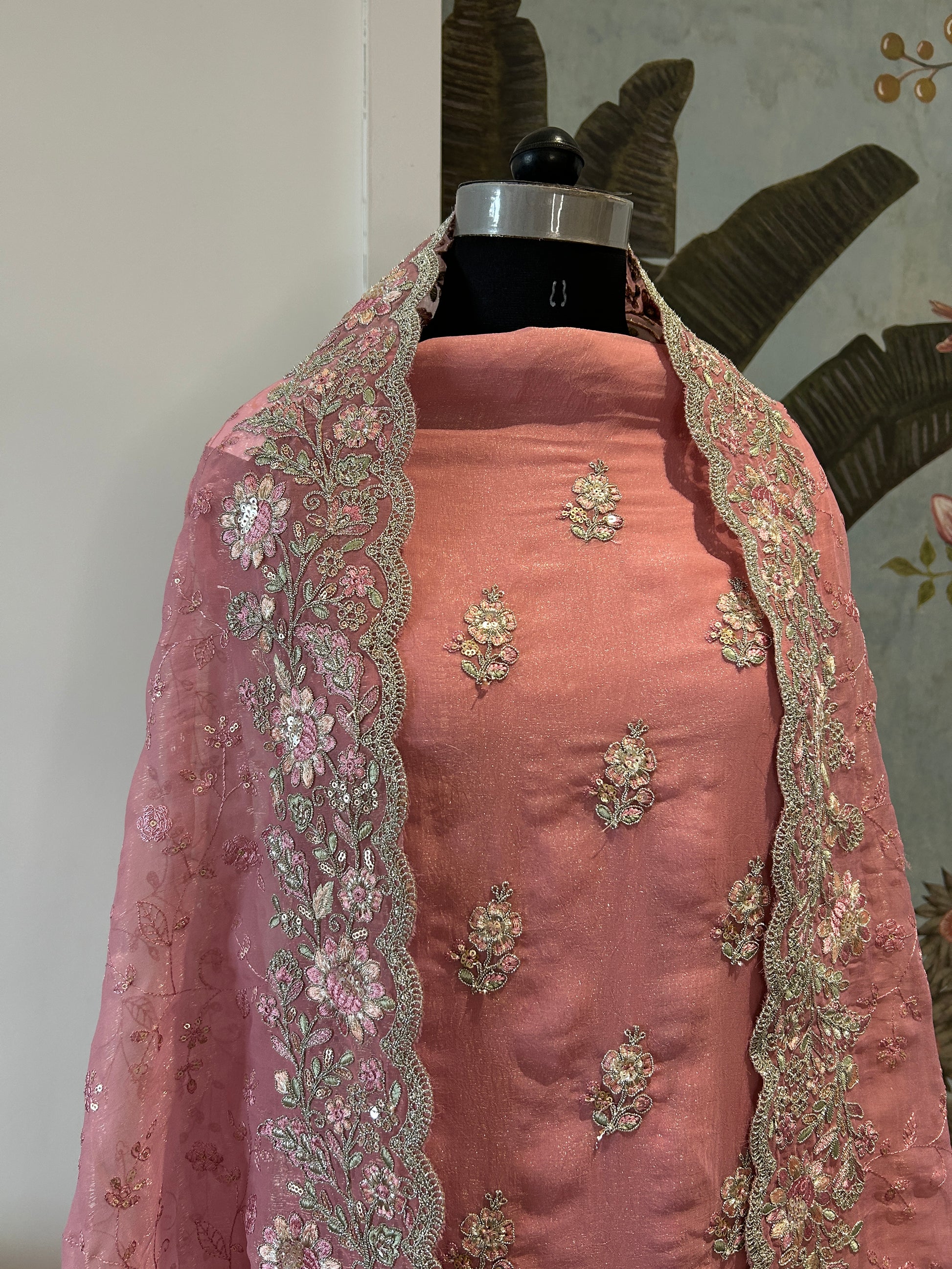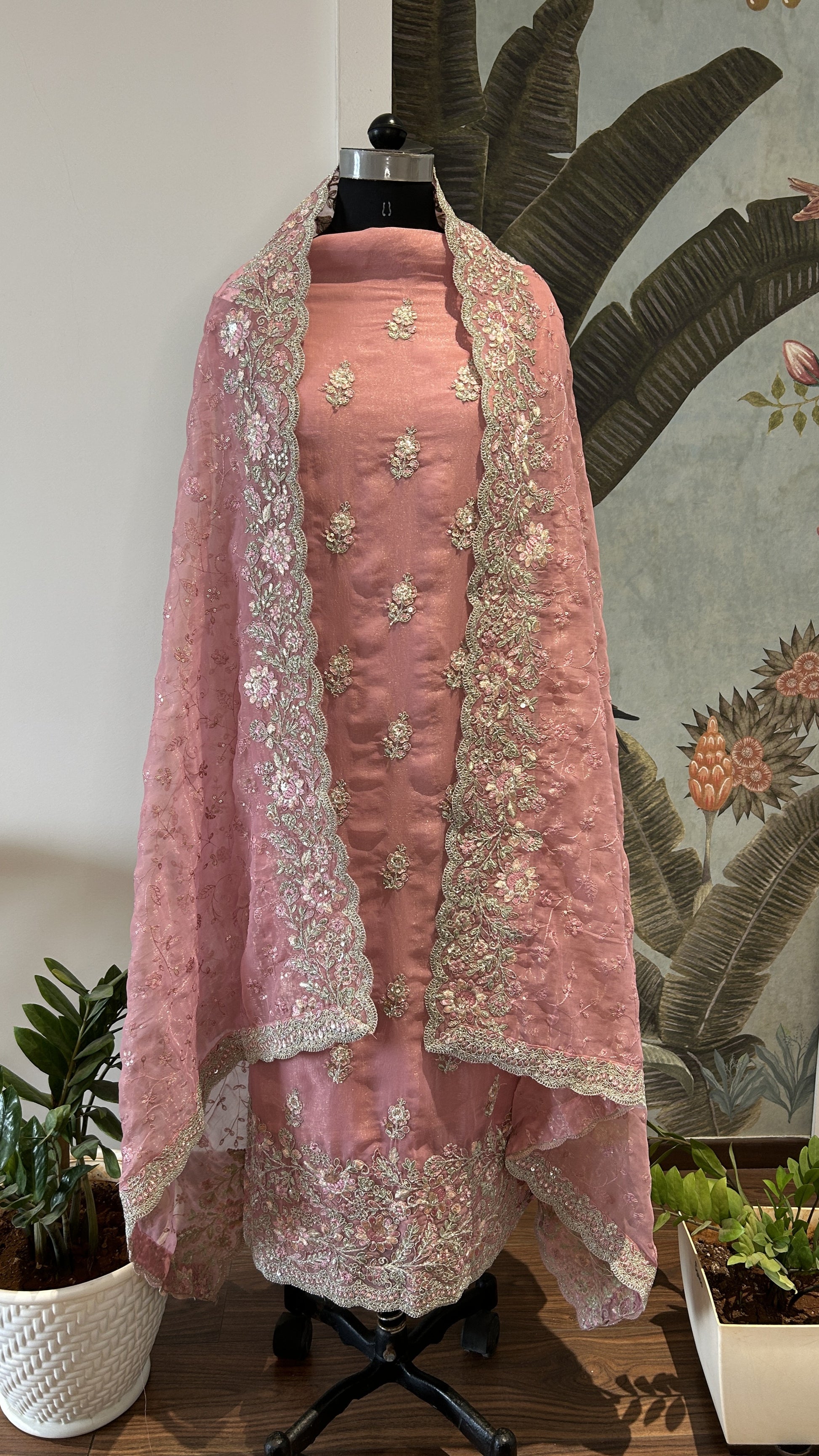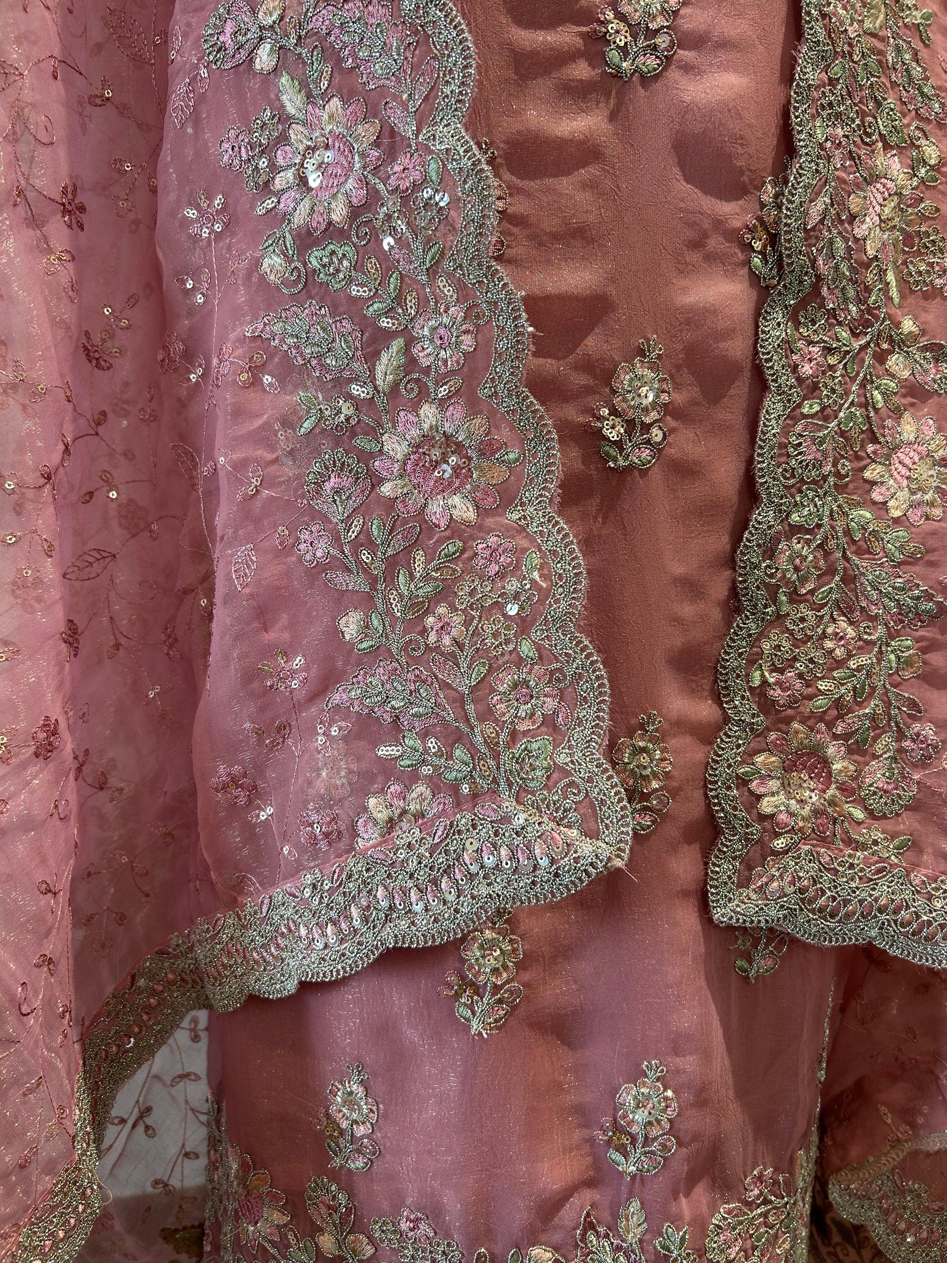 Soft shimmer tissue fabric paired with beautiful floral thread work across the top and daman, plus a gorgeous embroidered duppatta.