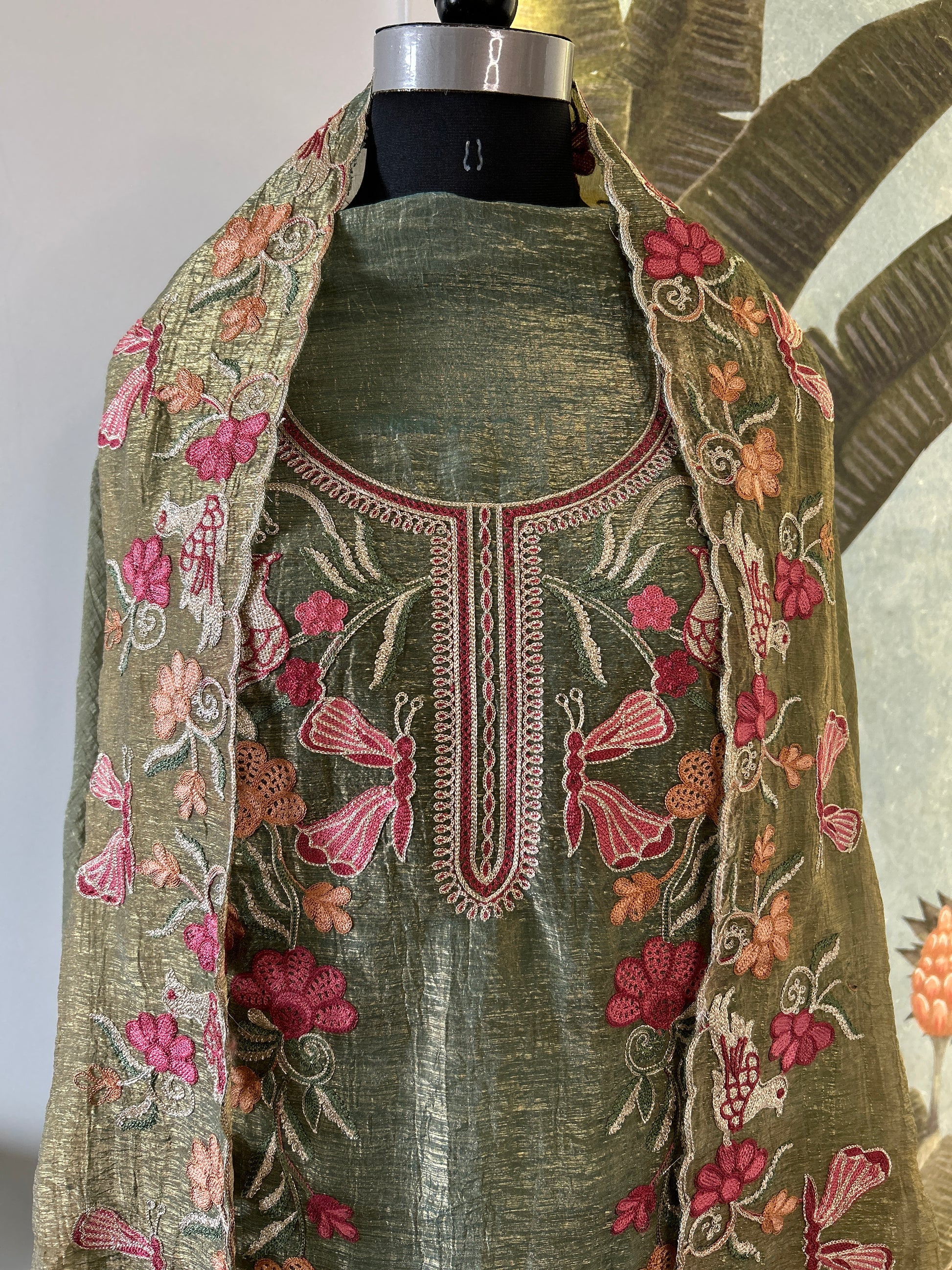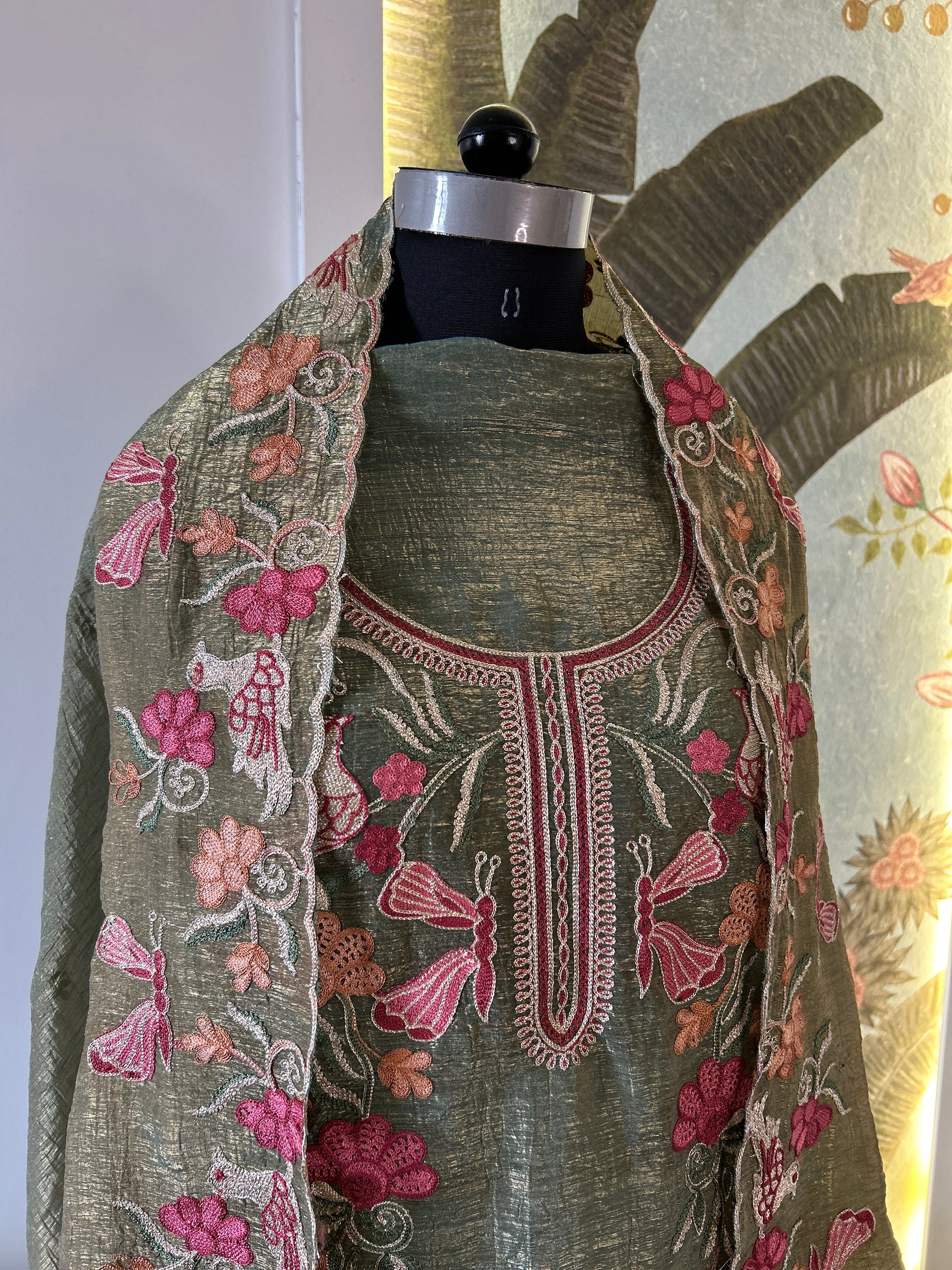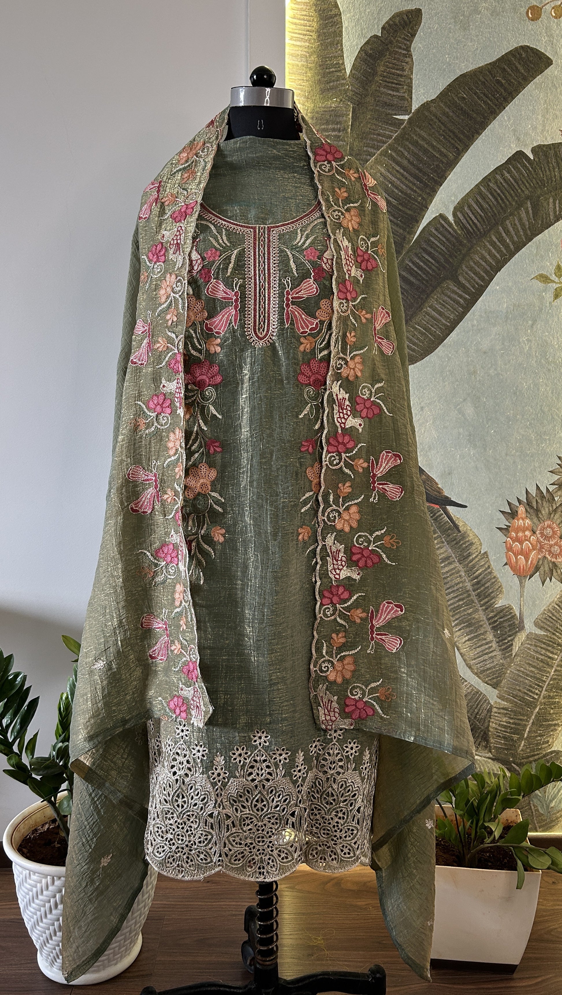 Phoolvati is a name that blooms with nostalgia and grace. Rooted in Hindi, it translates to “flower-like woman,” evoking imagery of softness, beauty, and quiet strength. This green ensemble lives up to that name—its sheer tissue shimmer fabric and delicate floral embroidery mirror the gentleness of petals, while the birds and butterflies adds a touch of timeless femininity.
