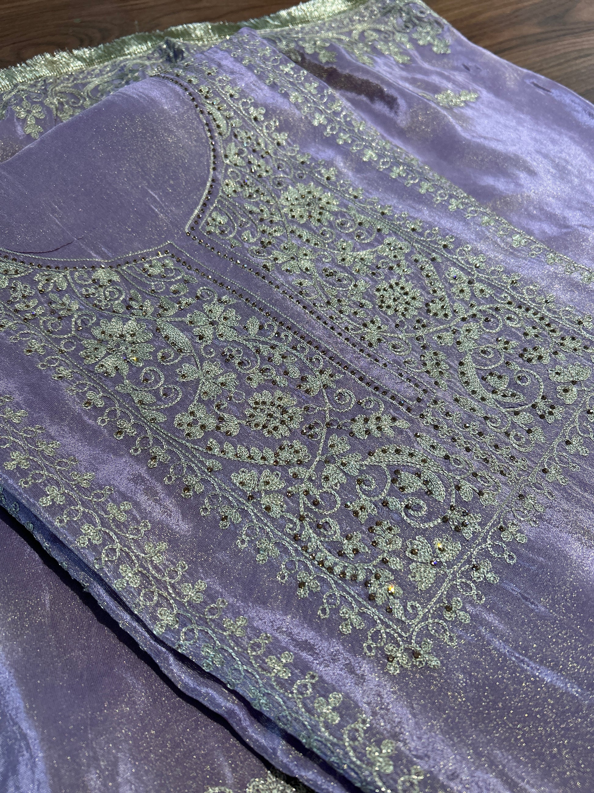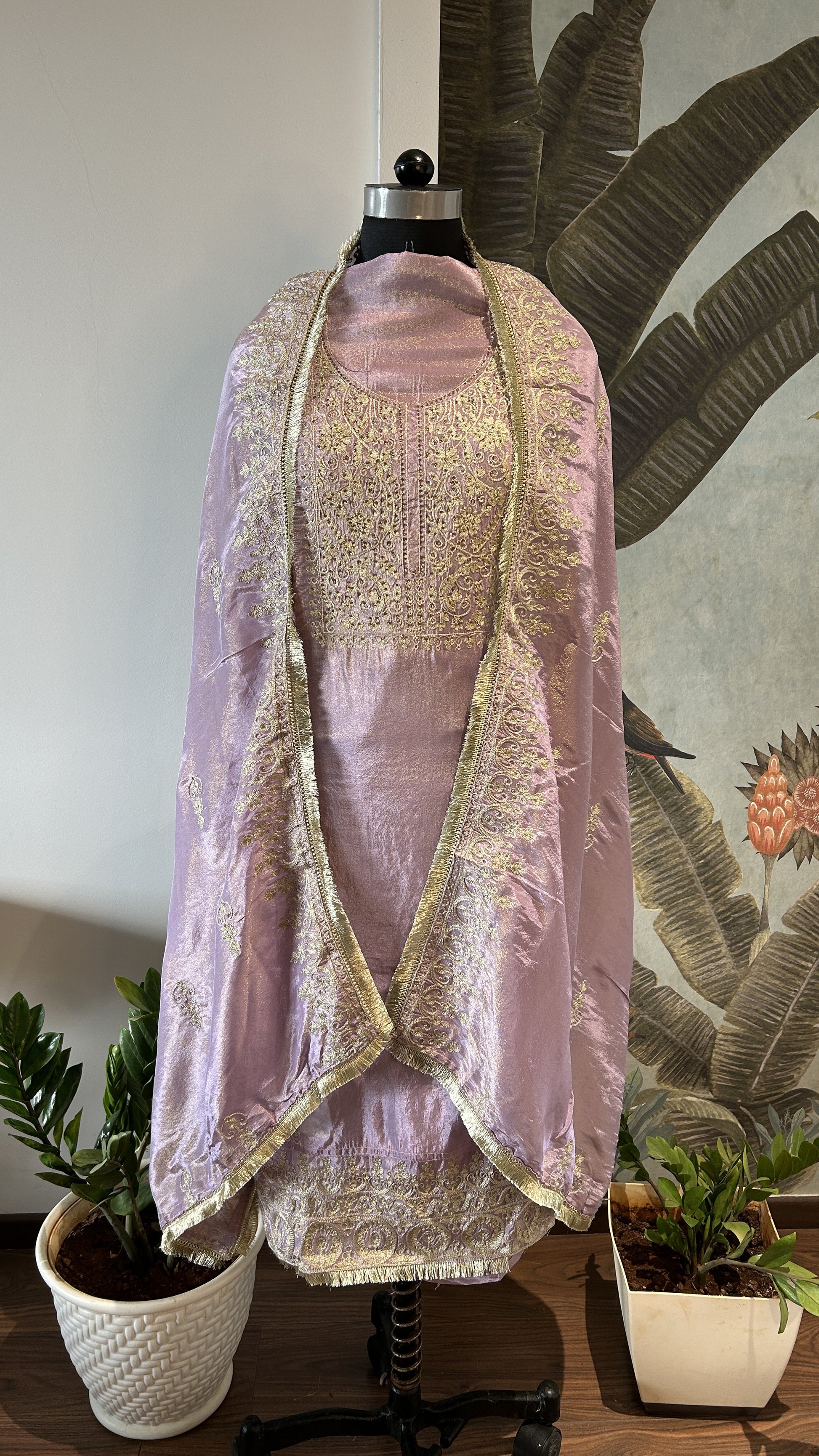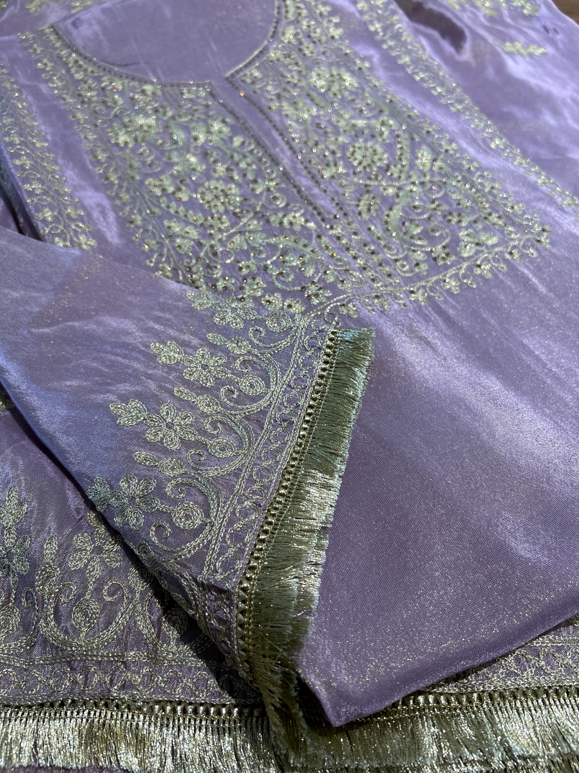 Rajneel is an exquisite three-piece ensemble that blends royal elegance with subtle charm. Crafted from embroidered silk fabric in a delicate lilac shade, it features intricate gold and mukaish embroidery on the neckline and ghera, enhancing its refined appeal.
