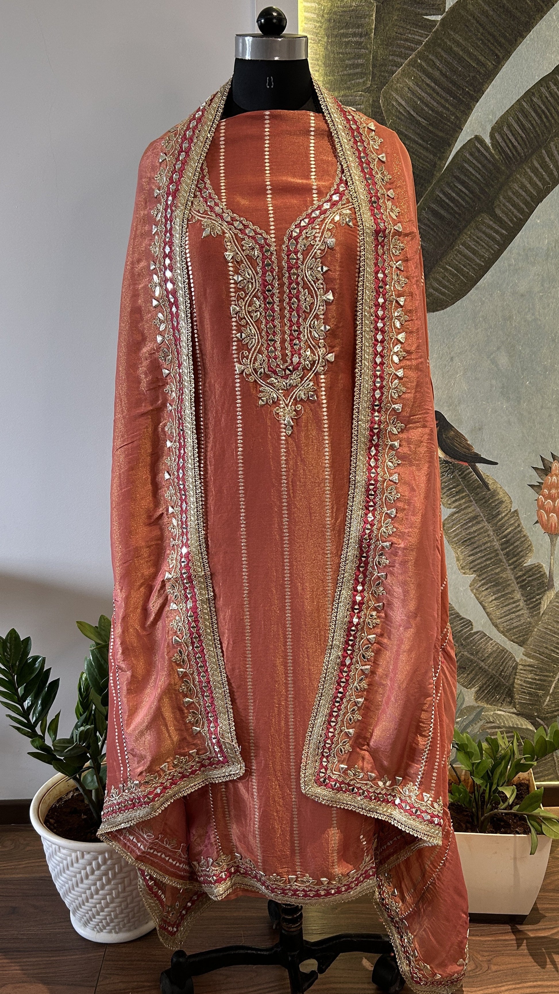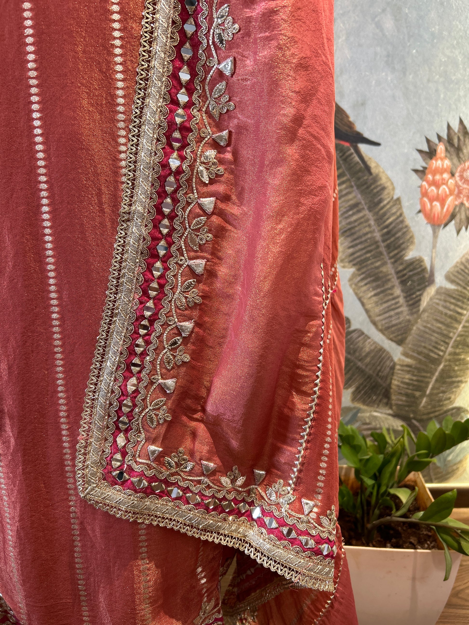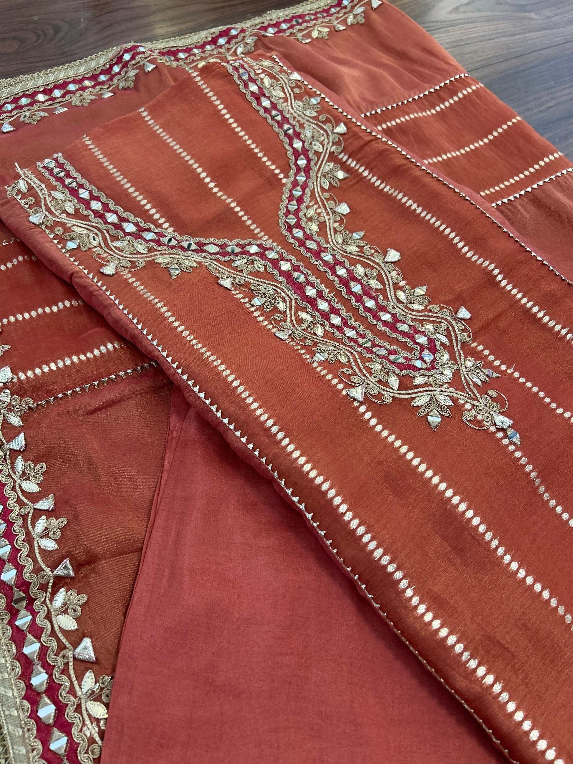 Rohika captures the essence of quiet strength with its radiant carrot orange hue. This expertly crafted three-piece set features a Banarasi silk shimmer top adorned with intricate hand embroidery, including delicate lace, gotta pati, and minute mirror work on a heavy neckline and border ghera design.