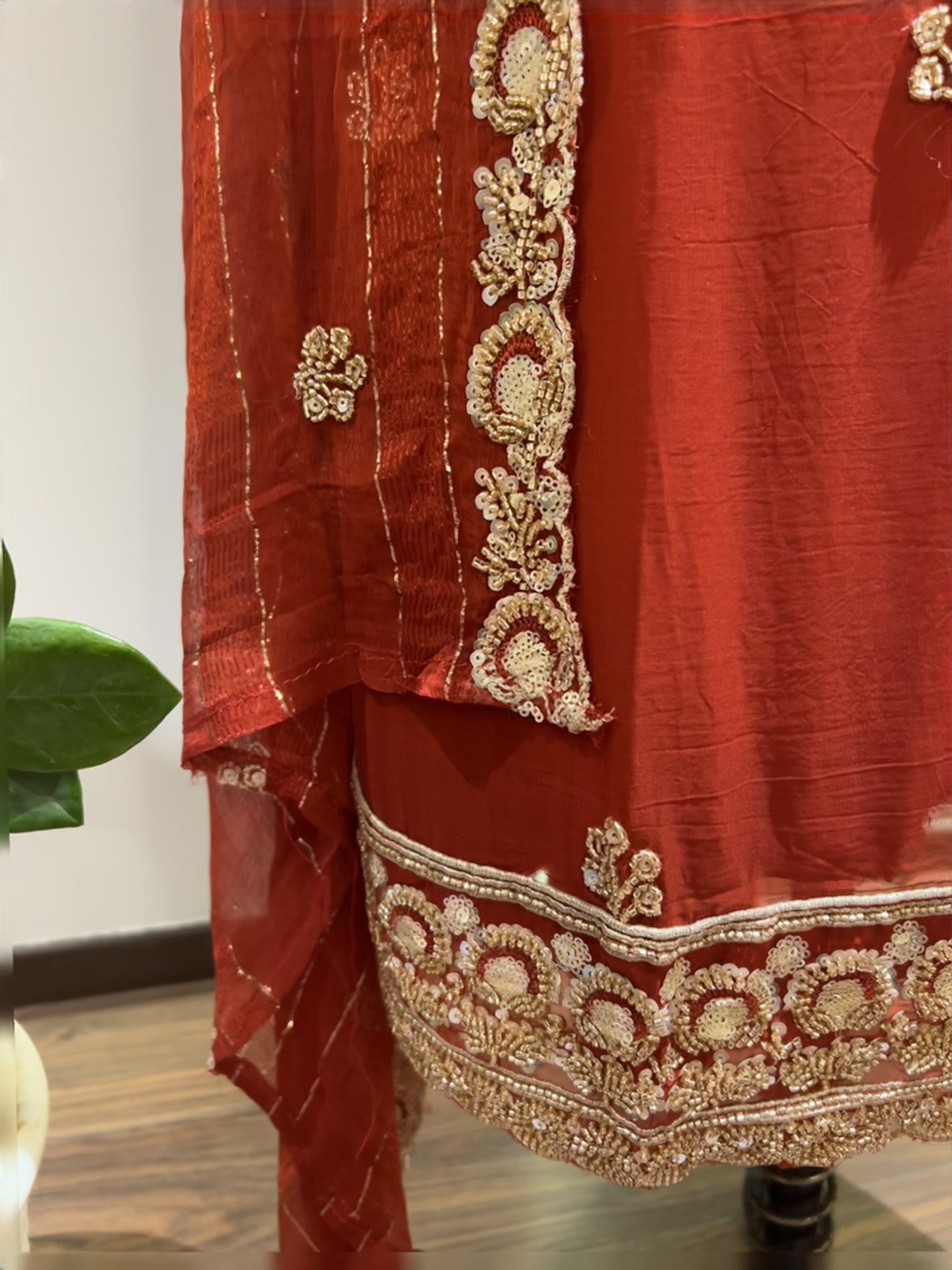 A celebration of feminine grace and floral opulence, Taab-e-Gul blooms in threads of gold over a canvas of ceremonial red. The circular and vine motifs echo temple bells and garden blossoms, creating a harmony of devotion and beauty. The beautiful dupatta with handwork embroidery on both long sides with gold thread lines all over , making its such a pretty dupatta with amazing fall.