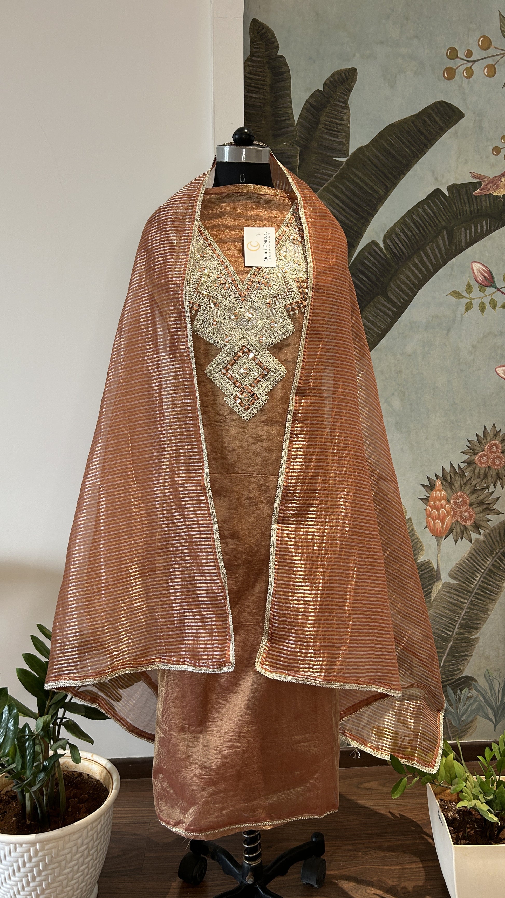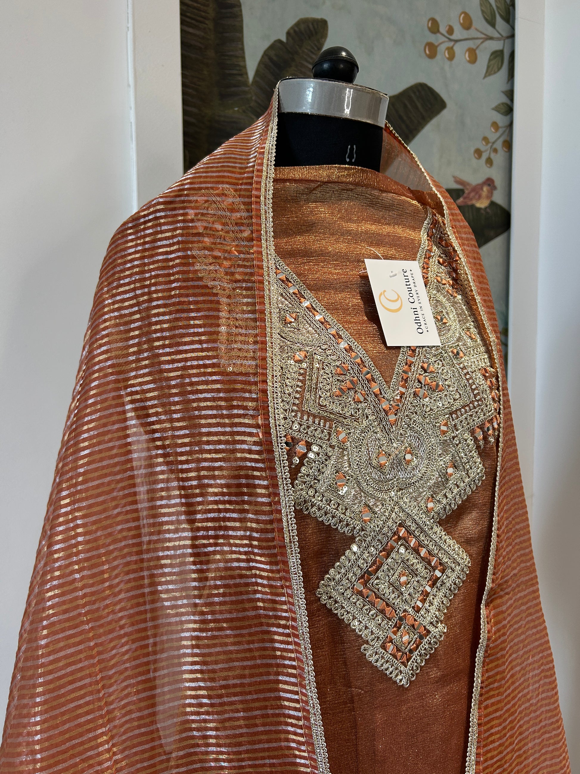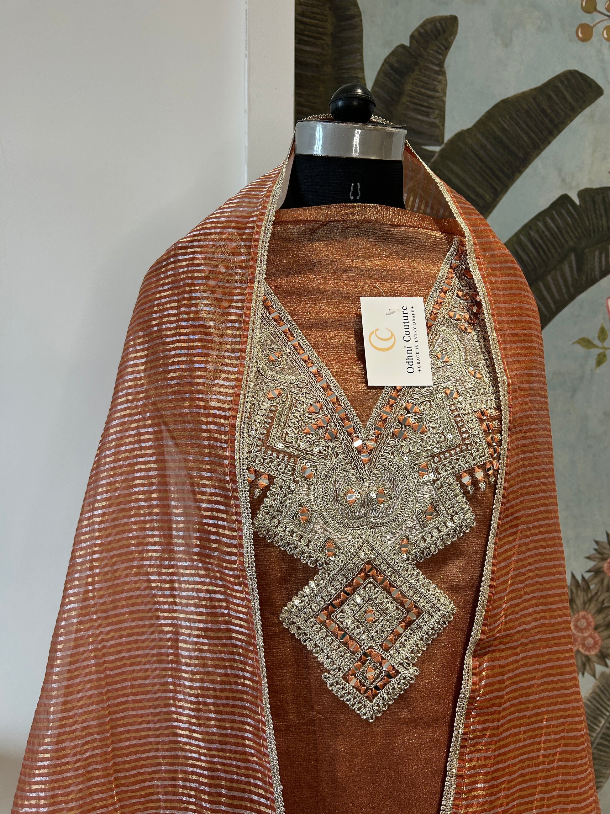The copper-toned top features delicate embroidery at the neckline, adding refined detail to your silhouette. Pair it with the coordinating striped dupatta for layered elegance and movement, while the plain bottom provides a clean, balanced foundation.