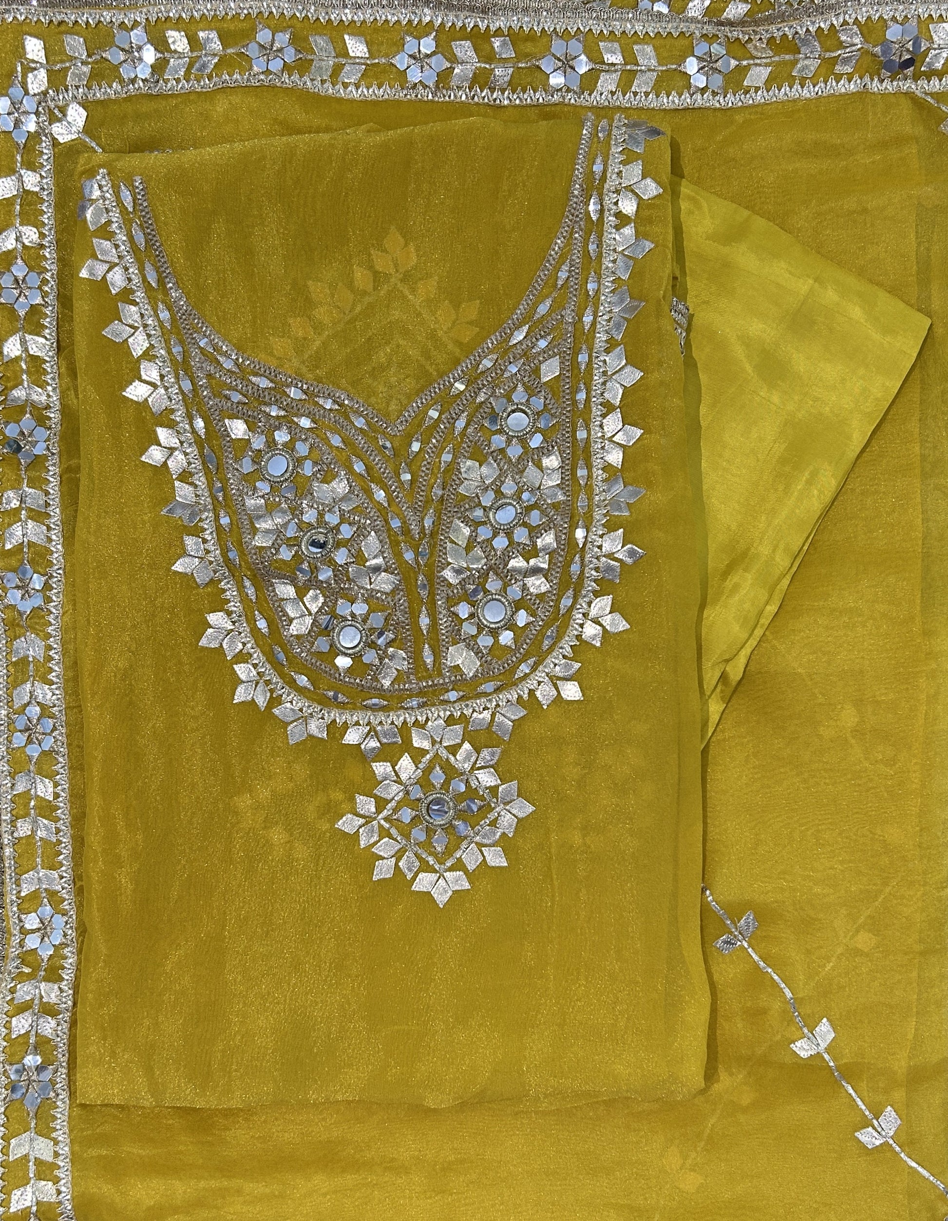 This elegant ensemble features a shimmer organza shirt (2.5 meters) adorned with authentic mirror and gotta patti work on the neckline, enhancing its sophisticated appeal. The coordinating shimmer organza dupatta (2.25 meters) is edged with delicate four-side gotta borders, perfect for festive occasions. Complemented by a smooth, lustrous silk bottom (2.5 meters), this combination offers both refined texture and graceful drape, making it an expert choice Weddings, traditional ceremonies, and festive evenings.