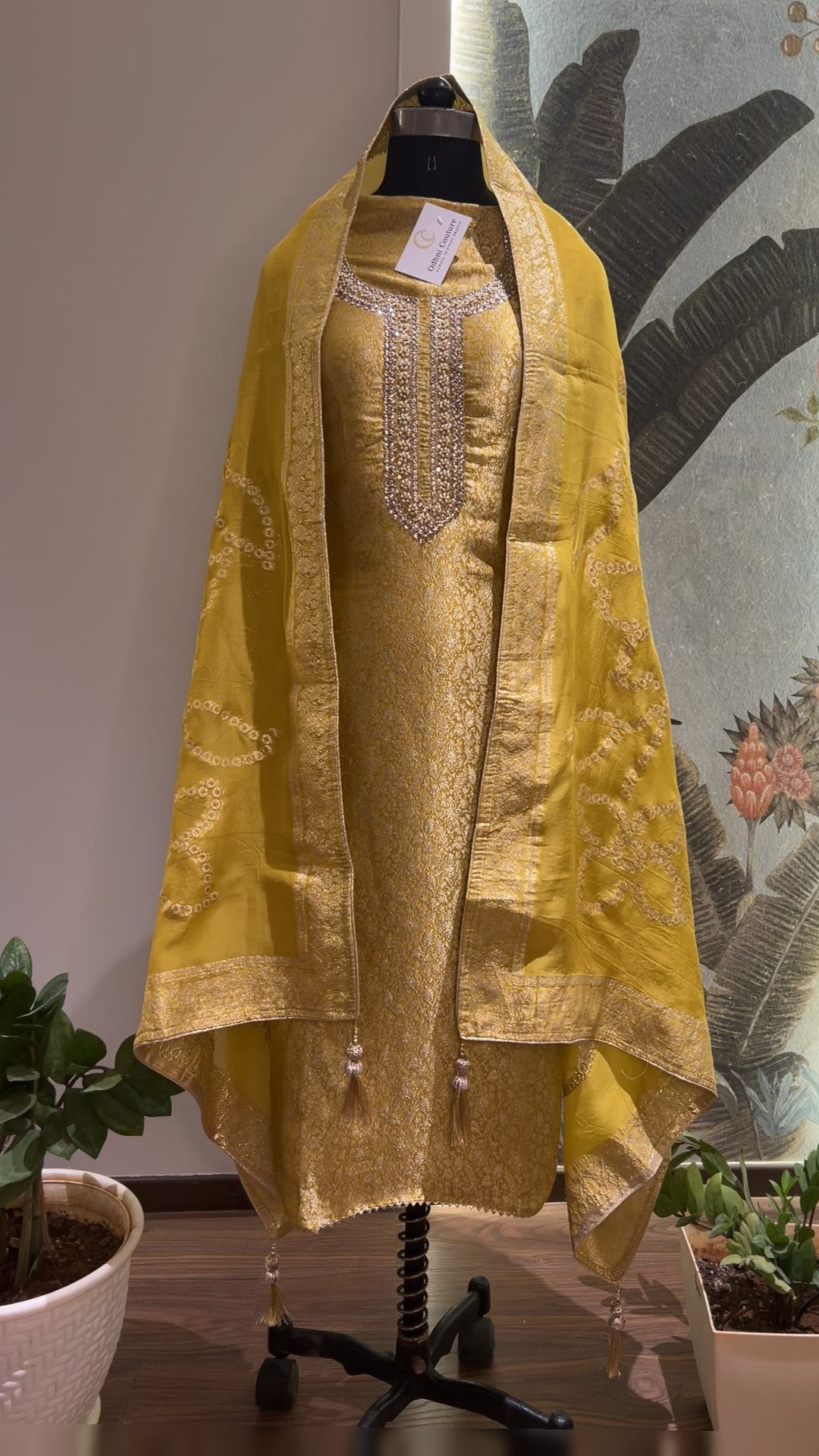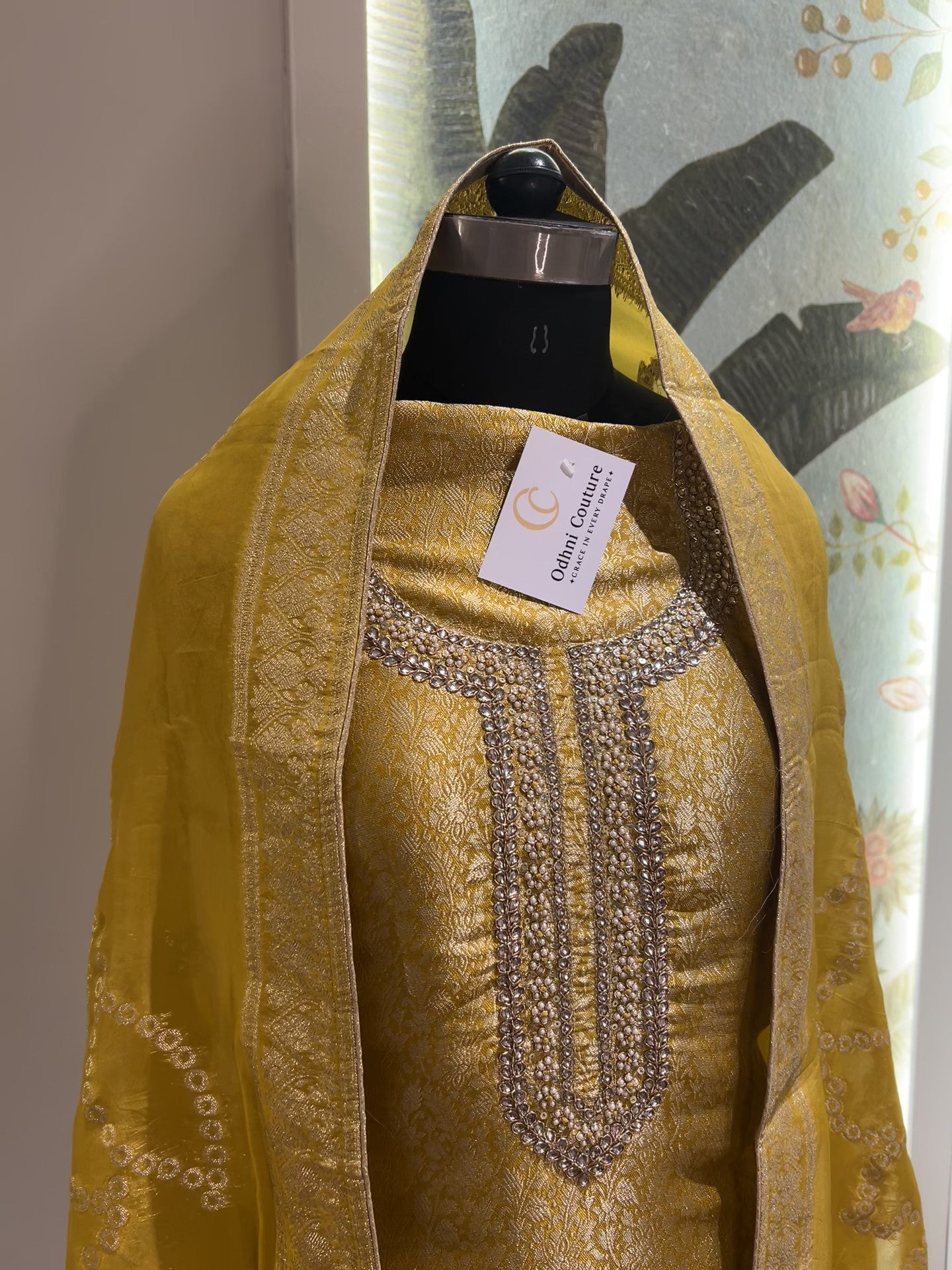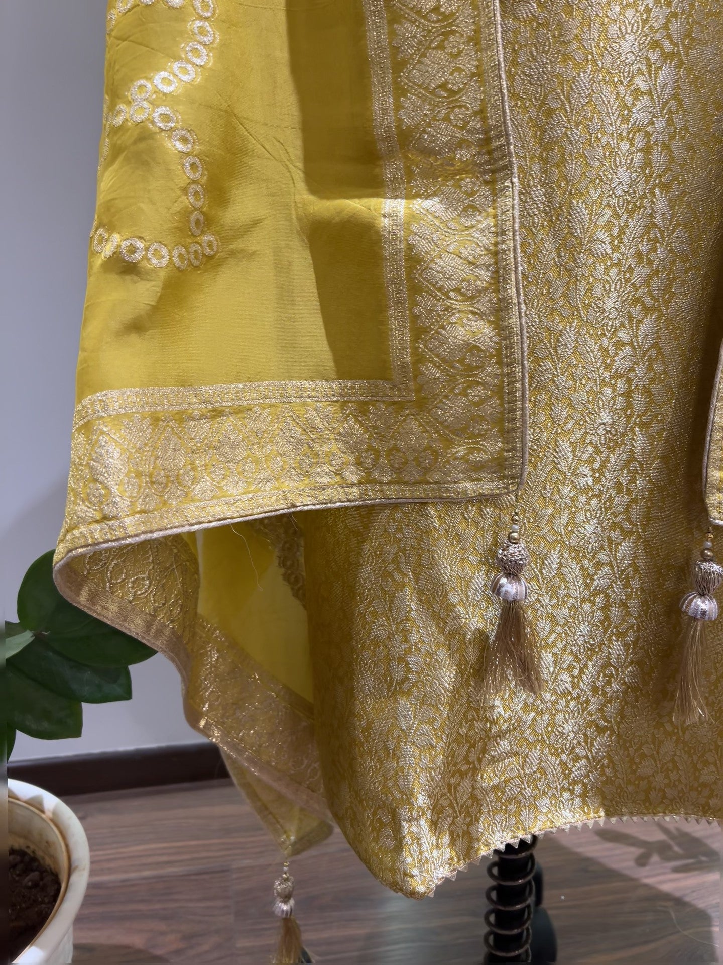 Sunehri Saaz is not just an ensemble—it’s a performance in silk and shimmer. The golden-yellow kurta, woven with a textured base, mirrors the radiance of morning ragas played in temple courtyards. Its neckline and front panel are embroidered with zari and resham, reminiscent of tanpura strings glinting in candlelight.