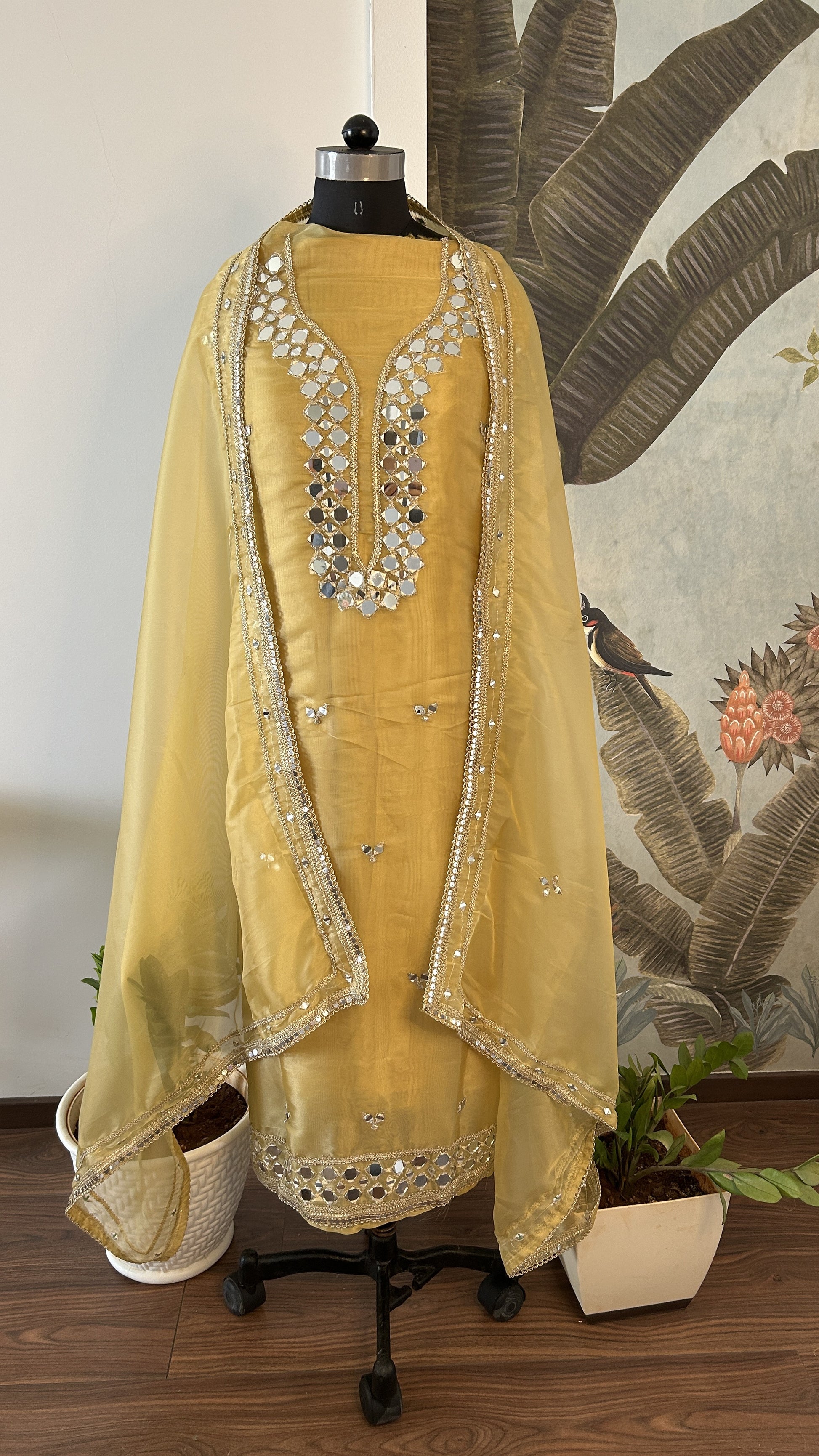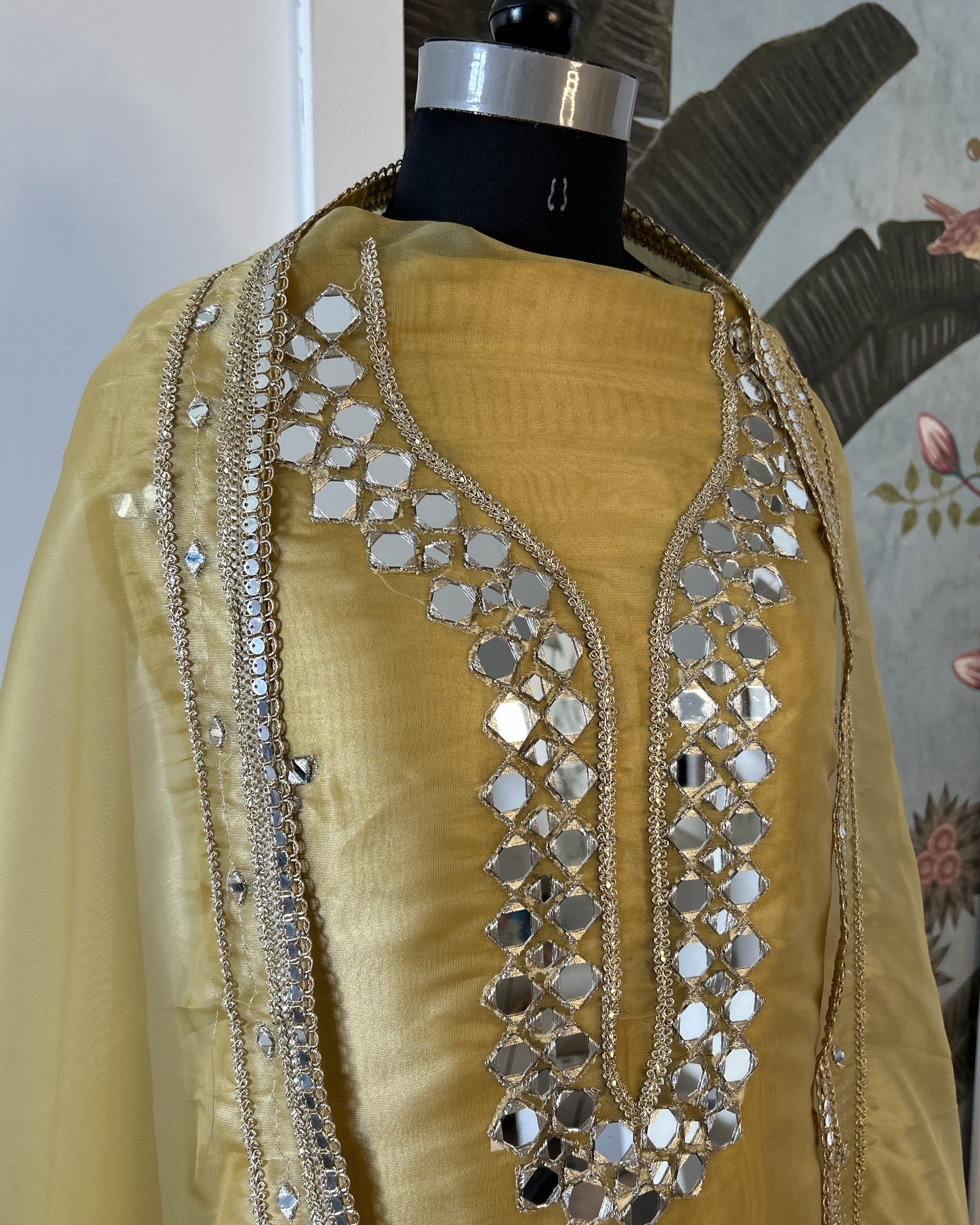 Surangana captures the essence of a celestial woman with its radiant and ethereal design. Crafted from delicate organza, the shirt features intricate mirror work on the neckline and ghera, complemented by subtle small botis scattered throughout.