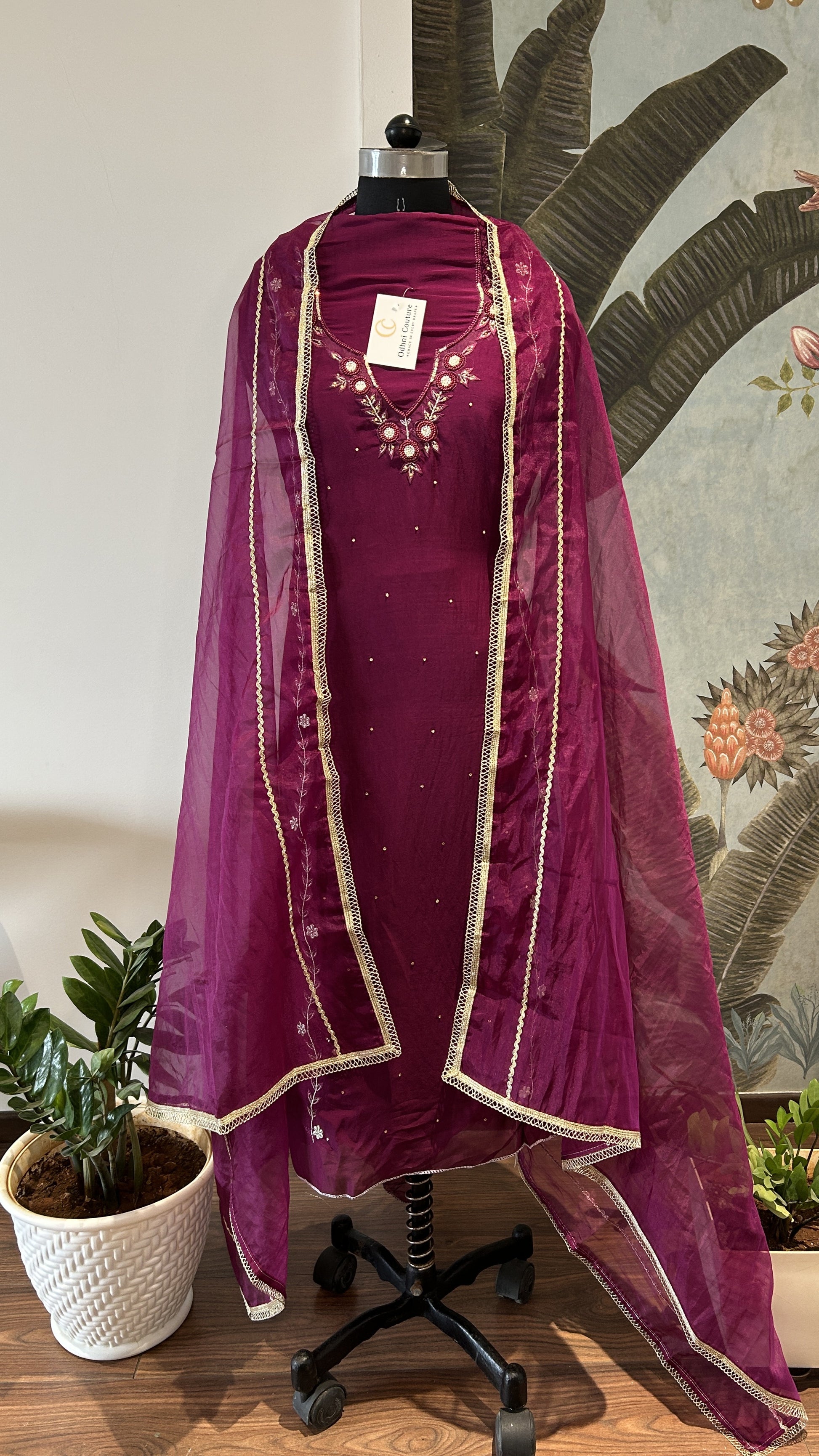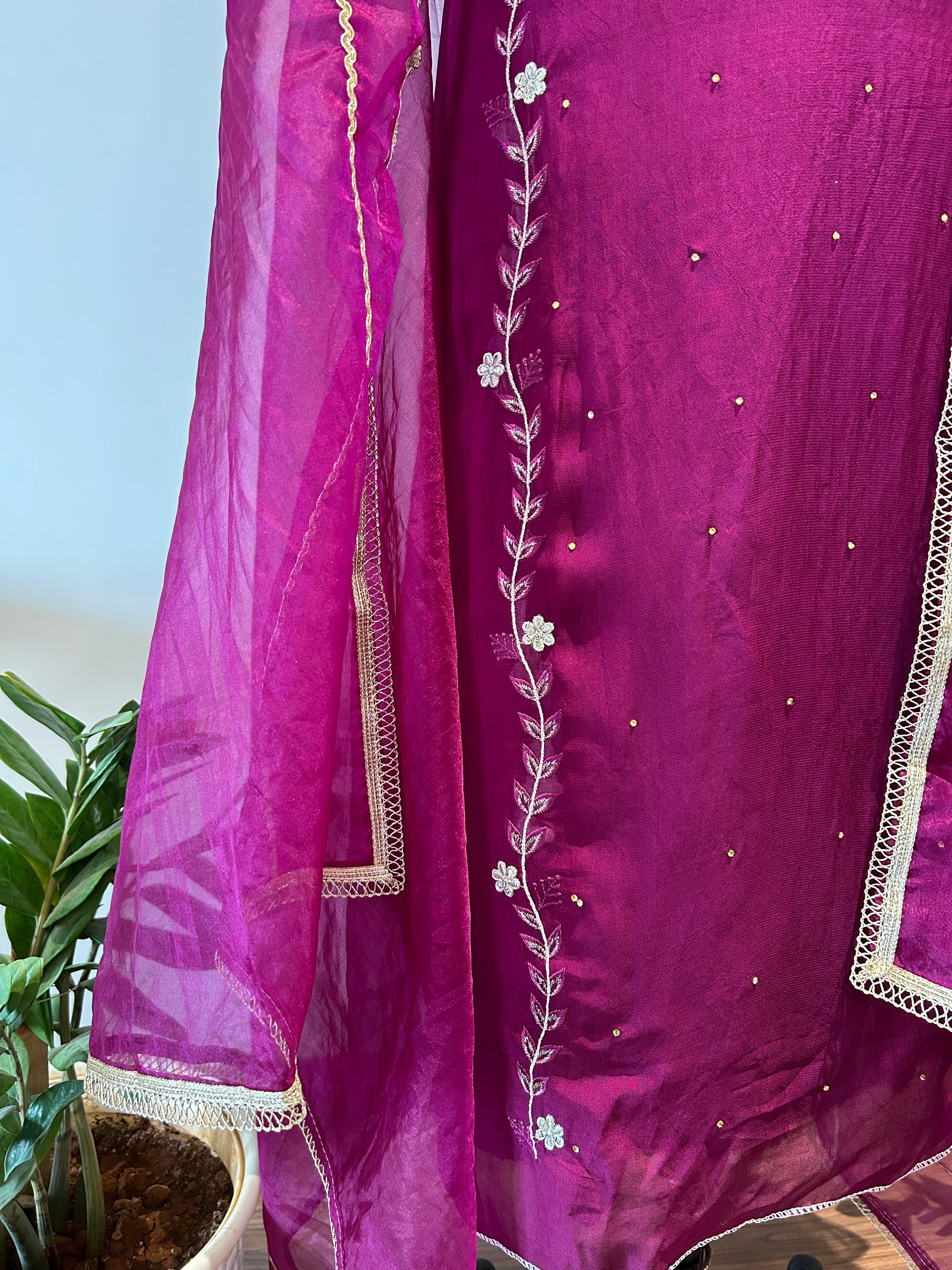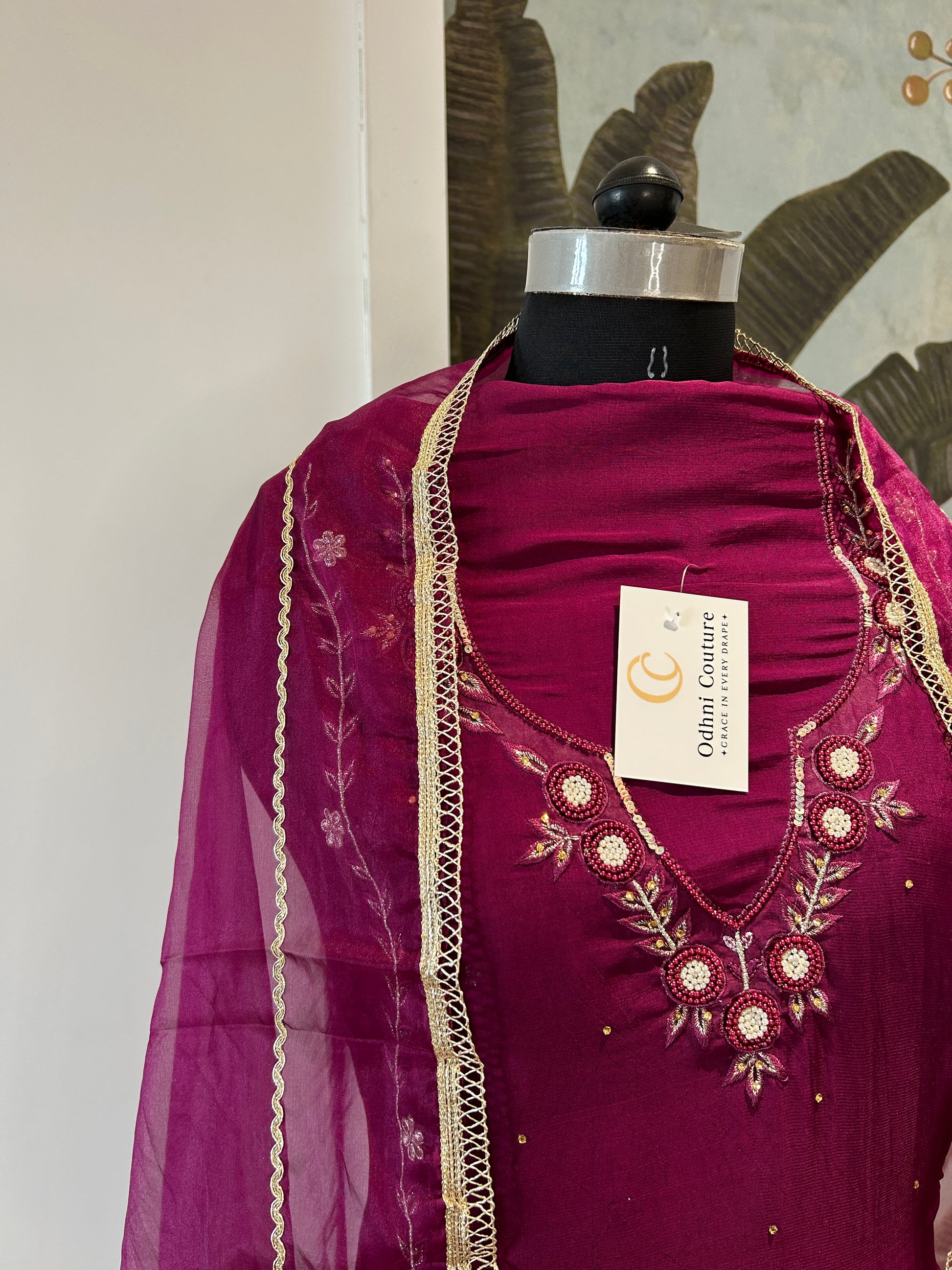 She walks in silence, yet every thread speaks. “Ruhani Gulab” is an ode to the twilight hour—when maroon skies kiss golden light, and grace finds its voice in stillness. The neckline blooms with floral zari embroidery, echoing the quiet poetry of a rose in prayer. A sheer dupatta, edged in gold, drapes like whispered blessings, completing the silhouette of serenity.