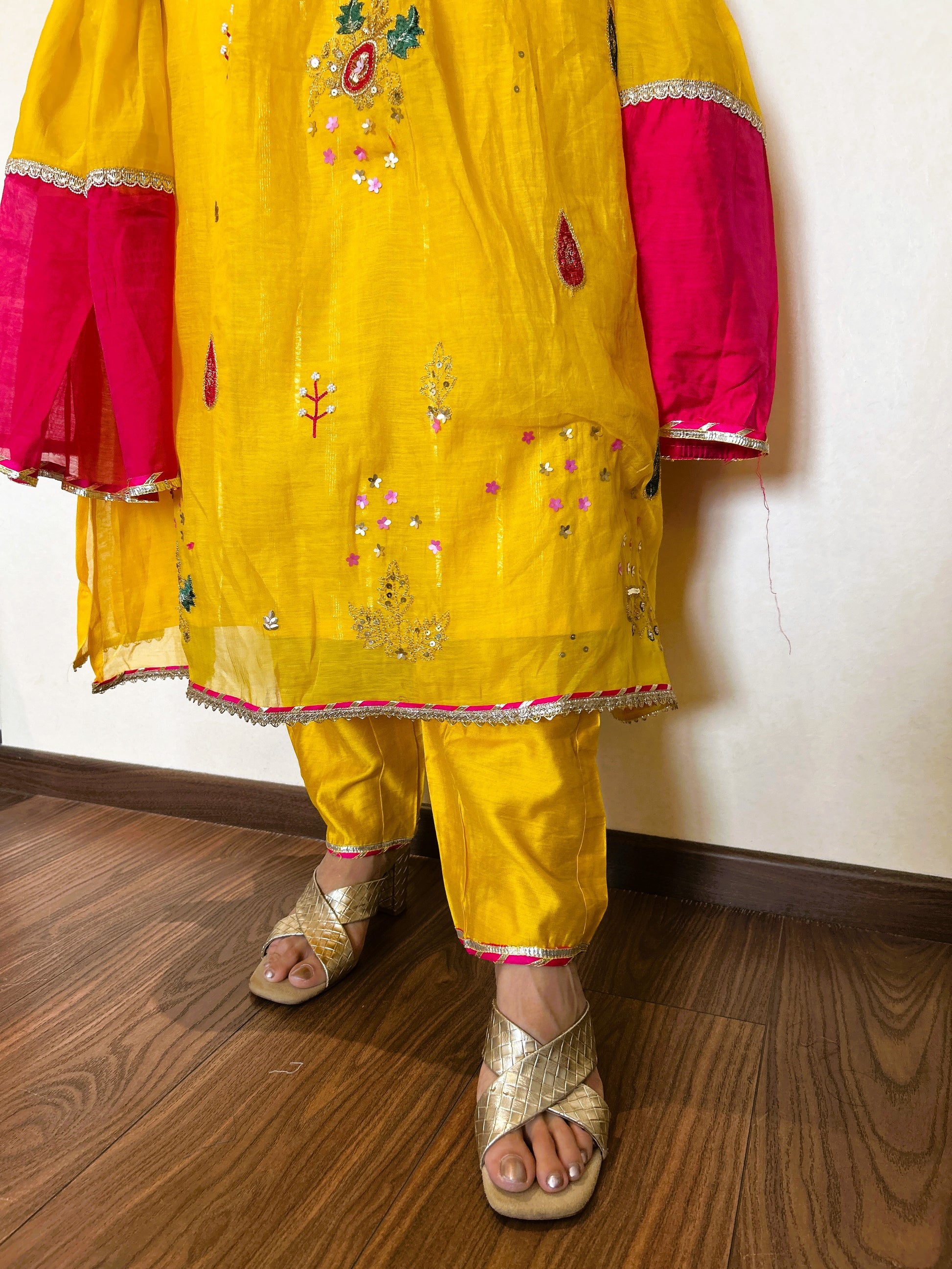Paired with traditional jewelry, this ensemble is perfect for haldi ceremonies, spring weddings, or cultural festivities where color and craftsmanship take center stage.